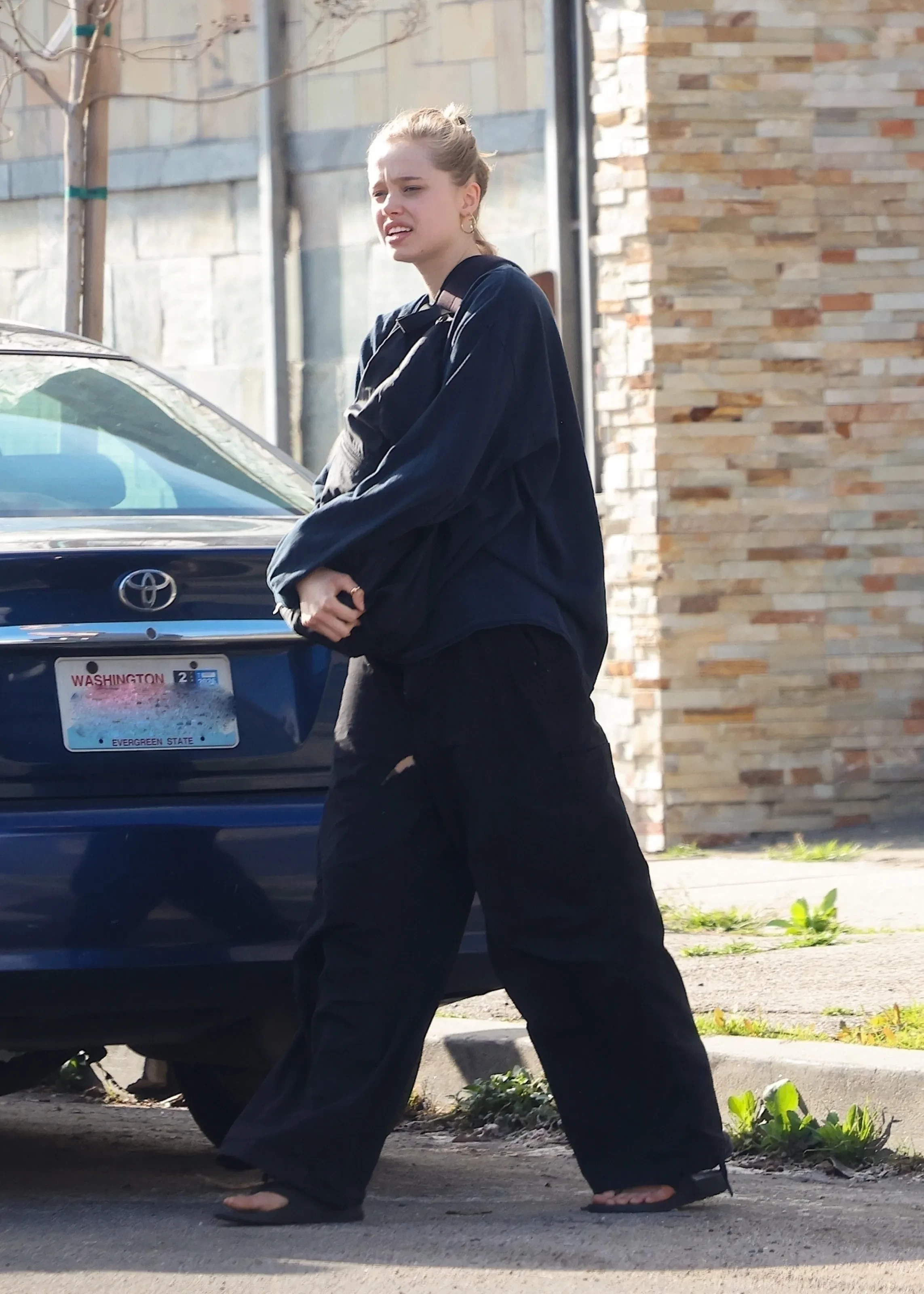 Шайло была облачена в объёмный темно-синий свитшот и широкие чёрные брюки, свои светлые волосы она убрала в высокий пучок (напомним, некоторое время Шайло носила короткую стрижку). Из аксессуаров у дочери Джоли замечены золотое кольцо на большом пальце и крупные серьги-кольца.