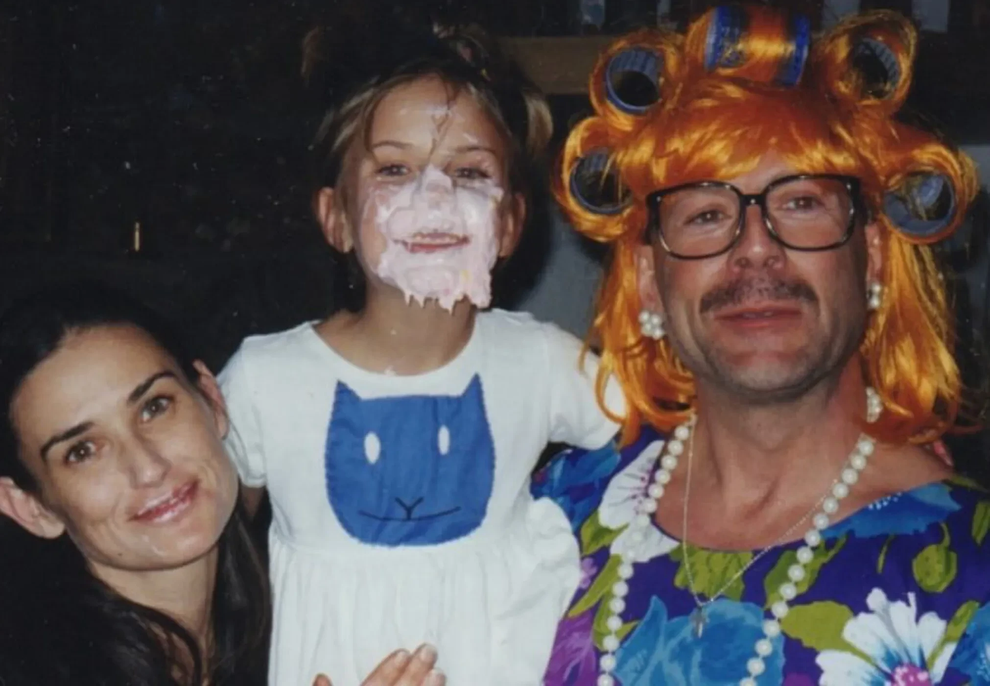 На снимке запечатлены Деми Мур, сама Таллула и Брюс Уиллис в костюме персонажа из мультсериала "Ох уж эти детки". Лицо Таллулы испачкано в креме от торта.