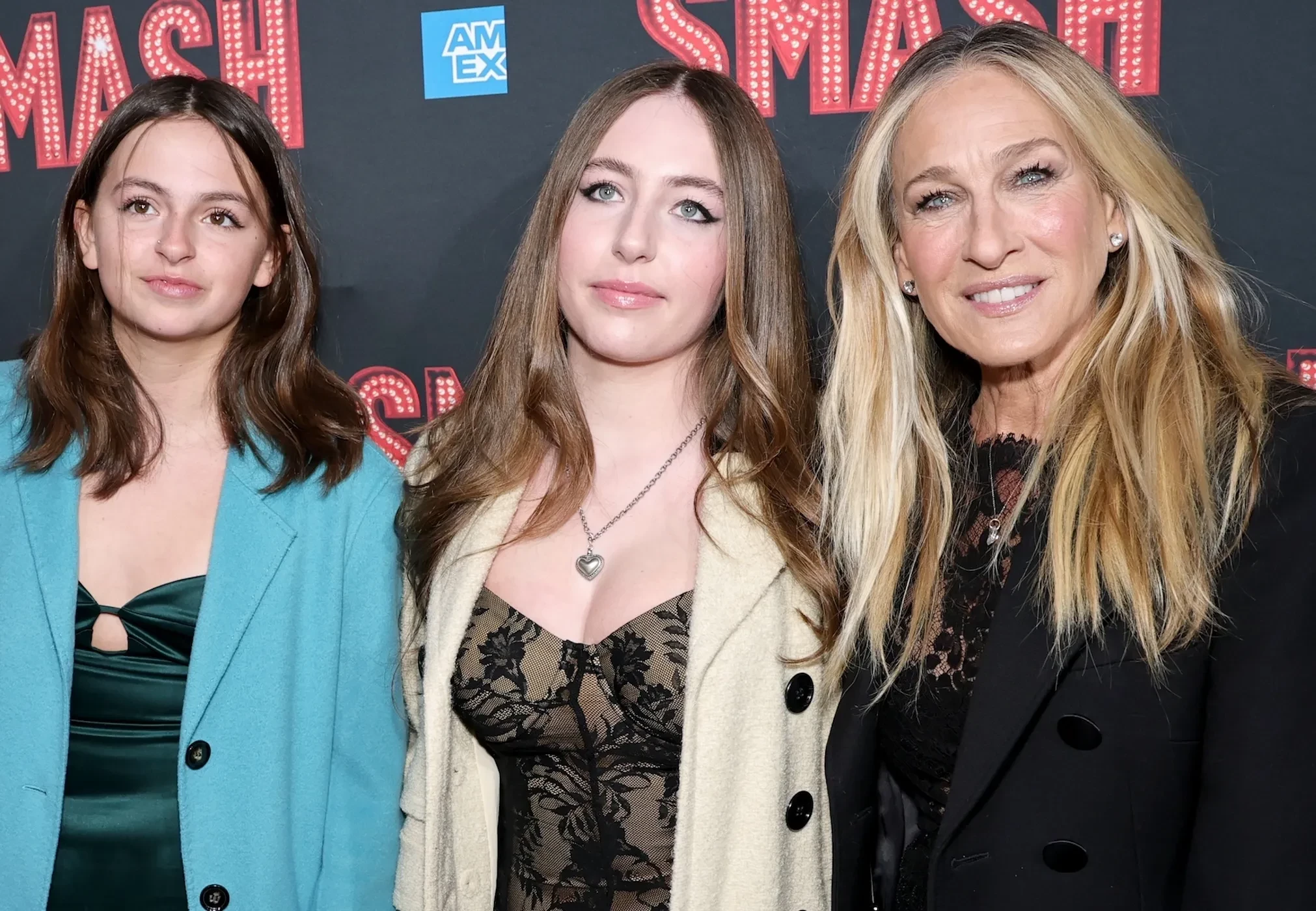 60-летняя звезда "Секса в большом городе" пришла в театр в чёрном платье с кружевом и жакете в тон. Марион тоже надела кружевное платье, но с декольте и бежевым пальто, а Табита позировала на семейном снимке в зелёном атласном платье и голубом пальто.