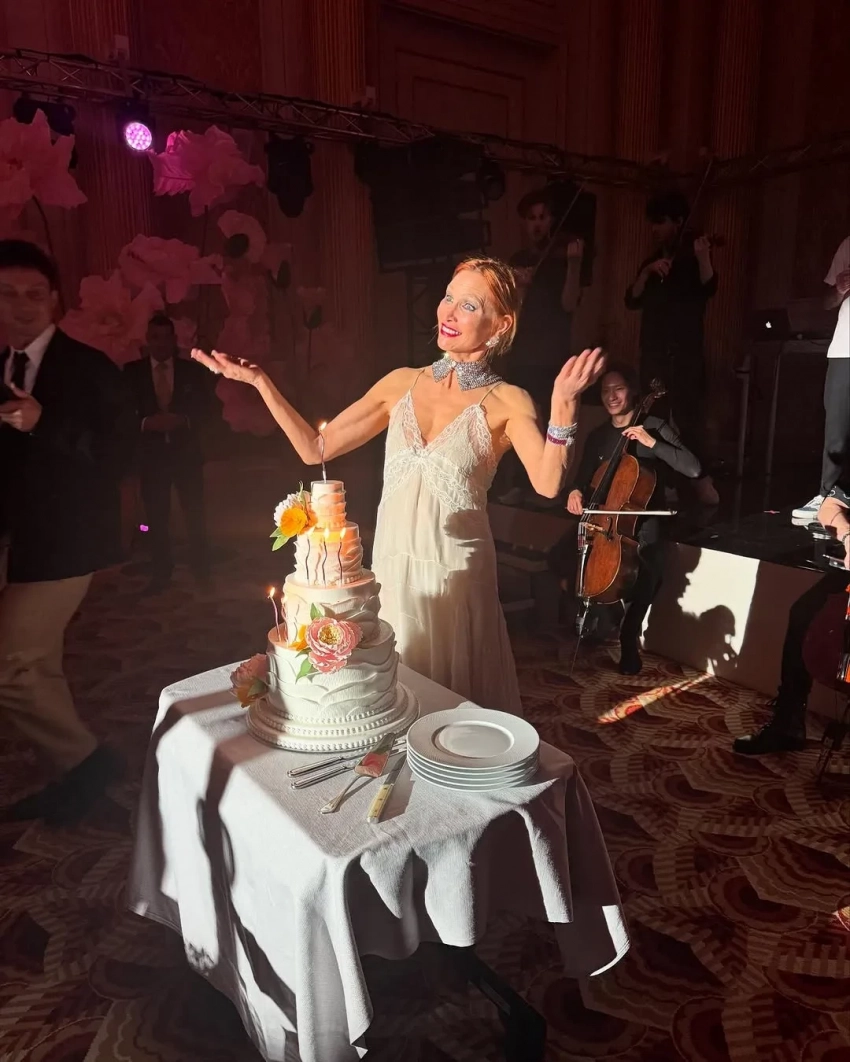 Елена Спиридоноваhttps://t.me/spletnik2006/28738Елена Спиридонова за вечер сменила два образа. На фото с гостями она позировала в серебристом платье без бретелей и бриллиантовом колье, а после задувала свечи на торте в платье-комбинации с кружевом и тоже в бриллиантах.