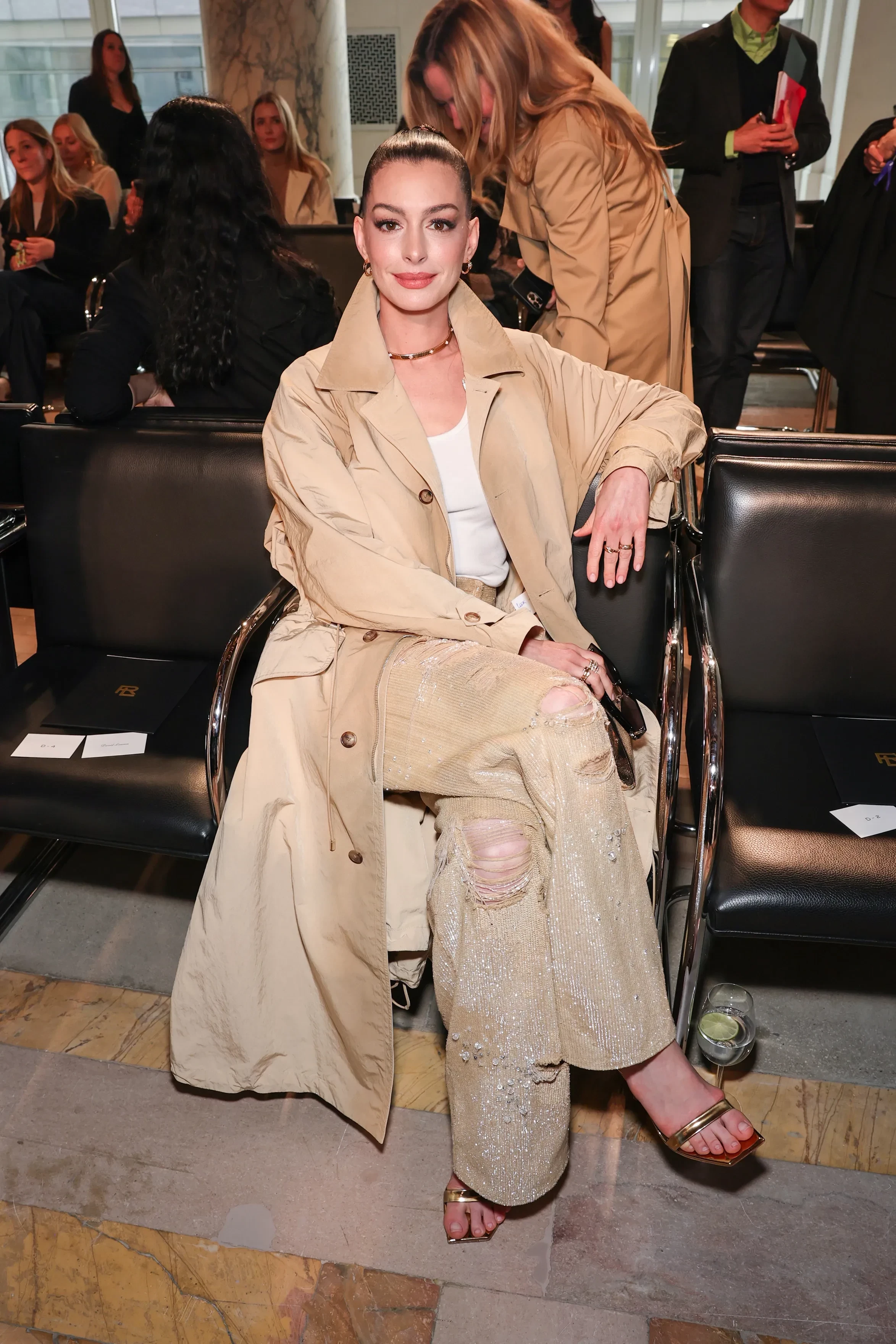 Хэтэуэй сидела в первом ряду шоу: для выхода в свет она выбрала бежевый тренч и брюки в цвет, расшитые пайетками, образ завершал простой белый топ. Однако комментаторов в сети больше привлекло лицо актрисы: многие считают, что она прибегла к услугам пластического хирурга, и сравнивают её "новую" внешность с внешностью Линдси Лохан, которую также подозревают в проведении пластической операции. Впрочем, нашлись и те, кто решил, что всё дело в удачной укладке: "Если она сделала операцию, то результат блестящий. Но давайте не будем недооценивать силу подтяжки лица с помощью тугого хвоста", — написал один из пользователей Reddit.
