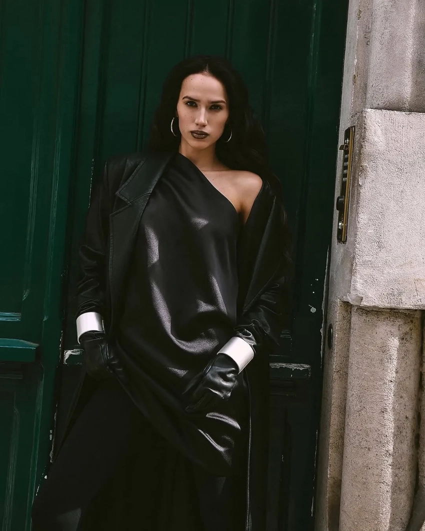 На фото 22-летняя фигуристка предстала в образе total black — кожаном плаще, мини-платье и легинсах в тон. Образ она дополнила мюлями и сумкой Chanel того же цвета. Из аксессуаров на Загитовой были крупные серьги-кольца и массивные браслеты. Спортсменка оставила волосы распущенными и сделала макияж в стиле женщины-вамп. На некоторых снимках в руках она держит журнал Forbes.