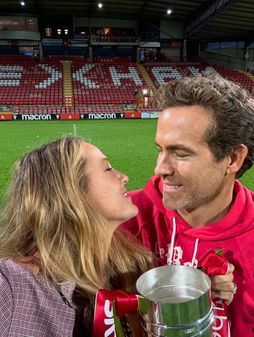 Блейк Лайвли и Райан РейнольдсКоманда Рейнольдса одержала победу над "Чарльтон Атлетик", обеспечив себе повышение в Лигу чемпионов на следующий сезон. Это значит, что им нужно ещё одно повышение, чтобы играть в Премьер-лиге, о которой мечтают знаменитые владельцы клуба.