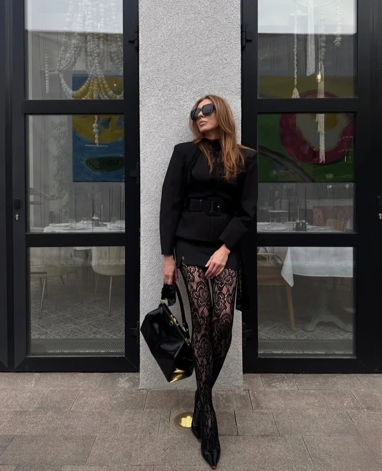 Светлана доказывает, что мини можно носить в любом возрасте. Главное — правильно расставлять акценты. Ну, и про ноги я бы тоже не стала забывать. Если они такие же стройные и прямые, как у Бондарчук, то почему бы не поэкспериментировать с мини. Светлана демонстрирует костюм в ретро-стиле, состоящем из жакета с объемными плечами и юбки мини. Изюминка образа — кокетливые кружевные колготки. Для Патриков, где живет звезда, такой лук, разумеется — ок! За пределами МКАДа — не думаю.