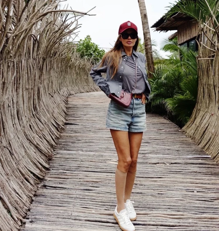 У Виктории такое строение фигуры, что она может поправиться и на 10 кг, но ноги у нее все равно останутся стройными. Потому длина мини — это, безусловно, вариант для Бони. Во время одного из путешествий блогер скомбинировала короткие джинсовые шорты с футболкой и рубашкой. Дополнила образ бордовым ремнем, такого же цвета сумочкой Gucci и кепкой от своего бренда. Плюс кеды в сочетании с капроновыми гольфами. Кто-то скажет: «А при чем тут капронки?» Но они, как и обычные трикотажные гольфы, сейчас в тренде.