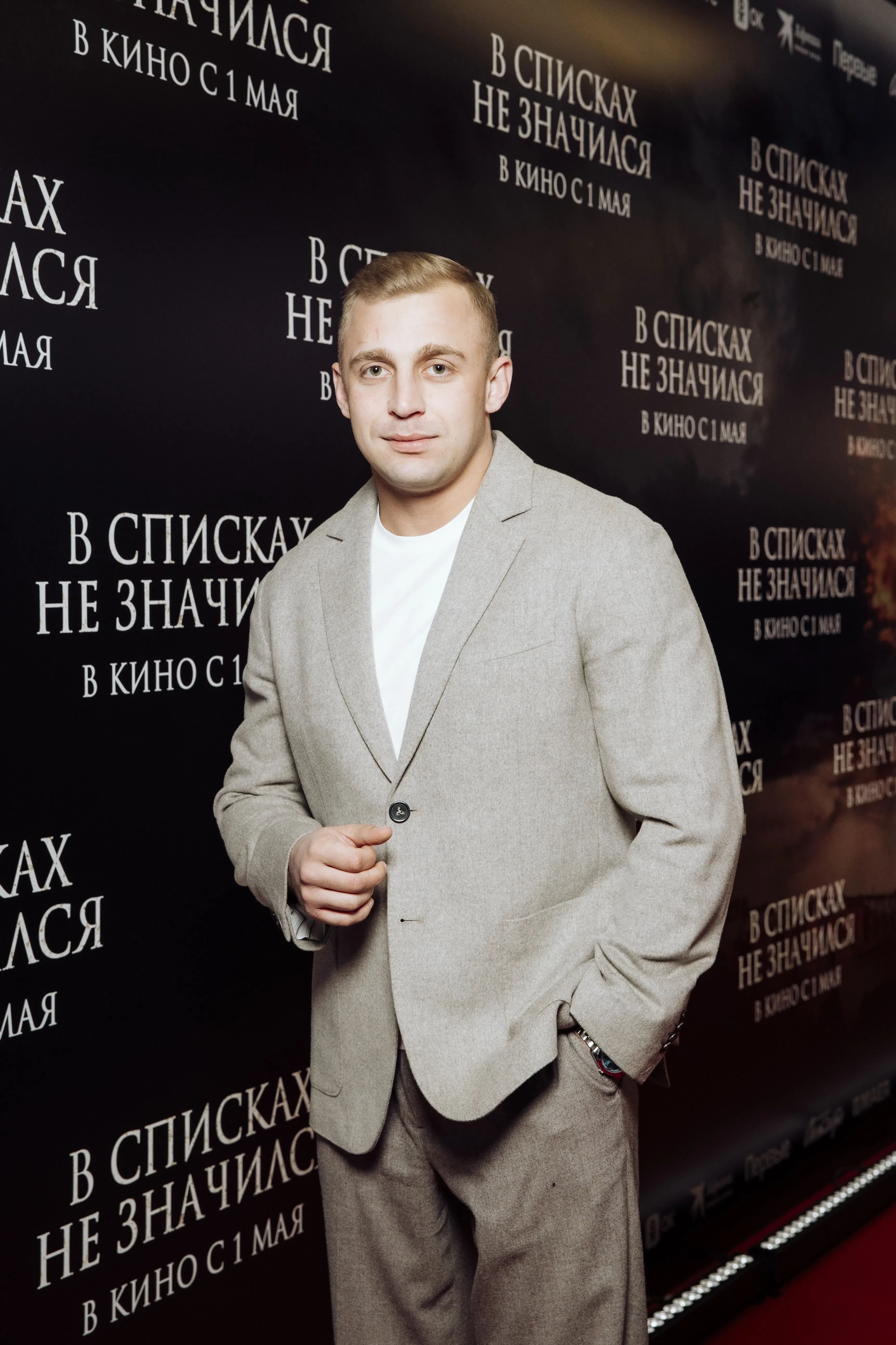 28 апреля в кинотеатре "Каро Октябрь" прошла премьера военной драмы "В списках не значился", приуроченная к 80-летию Великой Победы. Премьеру посетили Владимир Машков, который исполнил одну из главных ролей в картине, Ирина Винер, Николай Расторгуев, Саша Стоун, Тимур Вайнштейн и Яны Батыршина с дочерьми, Женя Малахова, топ-менеджер "Газпром-Медиа" Тина Канделаки и Артём Михалков, получивший недавно должность в холдинге.