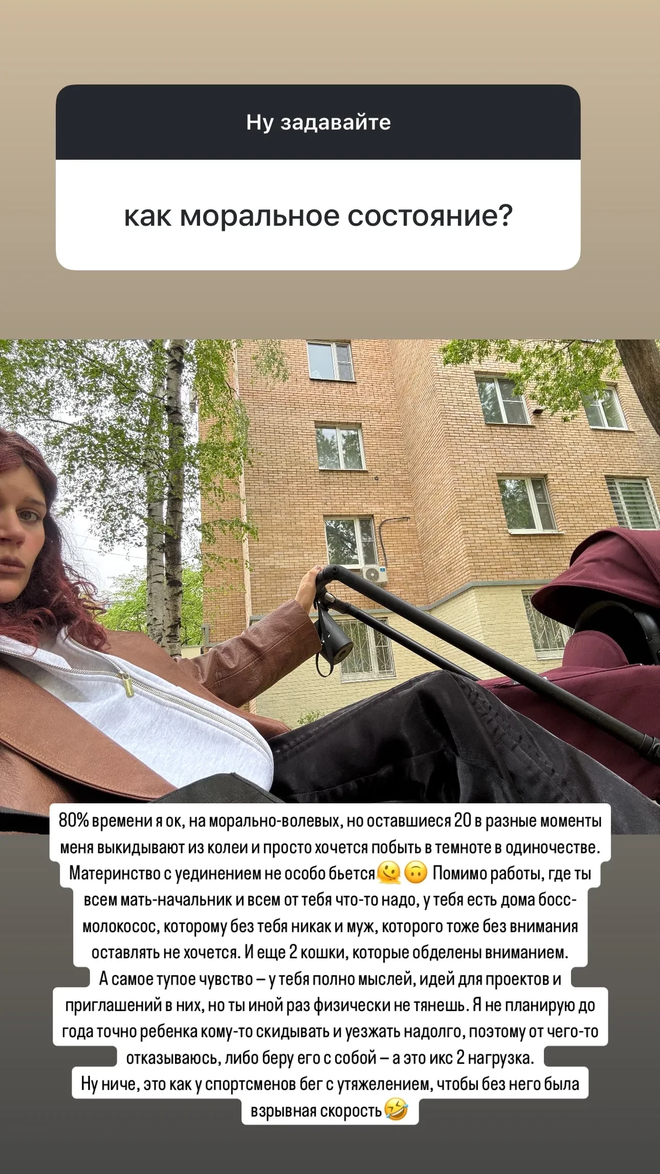 Также она рассказала о сильной усталости, которая мешает ей заниматься деятельностью: "Просто хочется побыть в одиночестве и темноте. А самое тупое чувство — у тебя полно мыслей, идей для проектов и приглашений в них, но ты иной раз физически не тянешь".