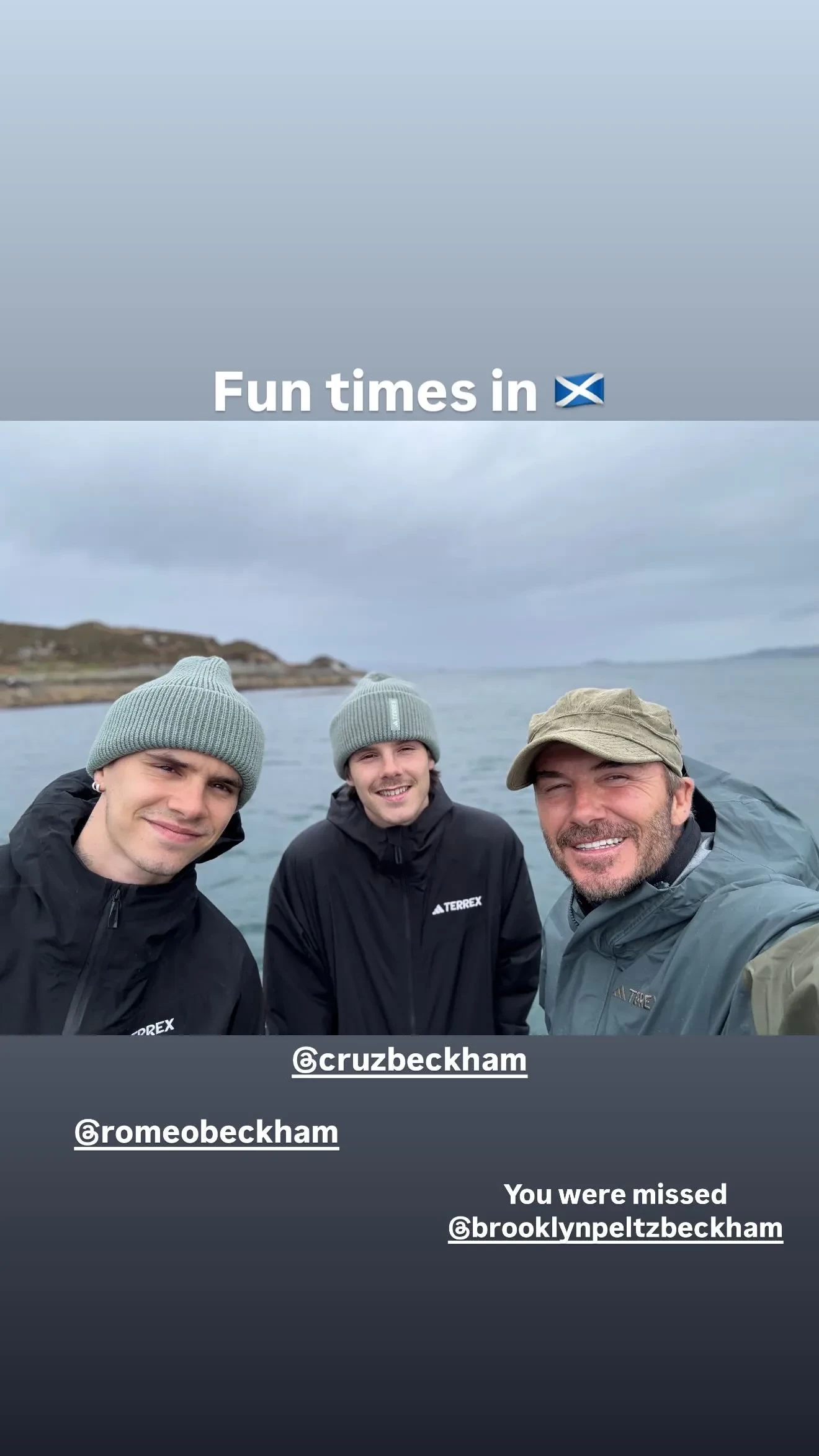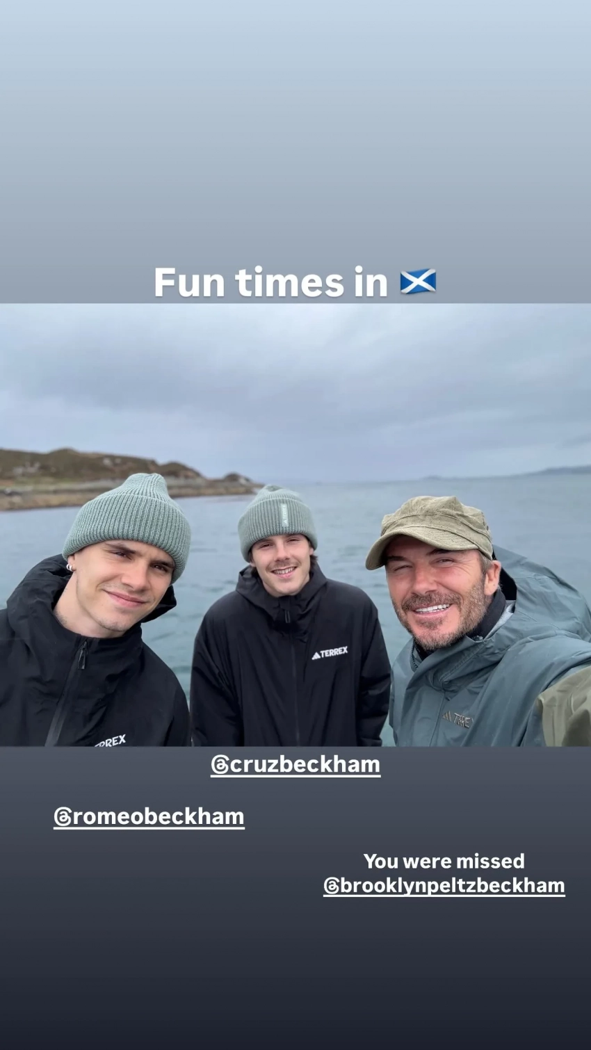Фото Дэвида БекхэмаПомимо прочего, одно из фото Бекхэм посвятил своему старшему сыну Бруклину, который не смог присоединиться к путешествию. Спортсмен отметил его на совместном снимке с другими сыновьями и подписал: "Тебя не хватало". Примечательно, что Бруклин не присутствовал и на других мероприятиях, приуроченных к юбилею отца, и не поздравил его в соцсетях.