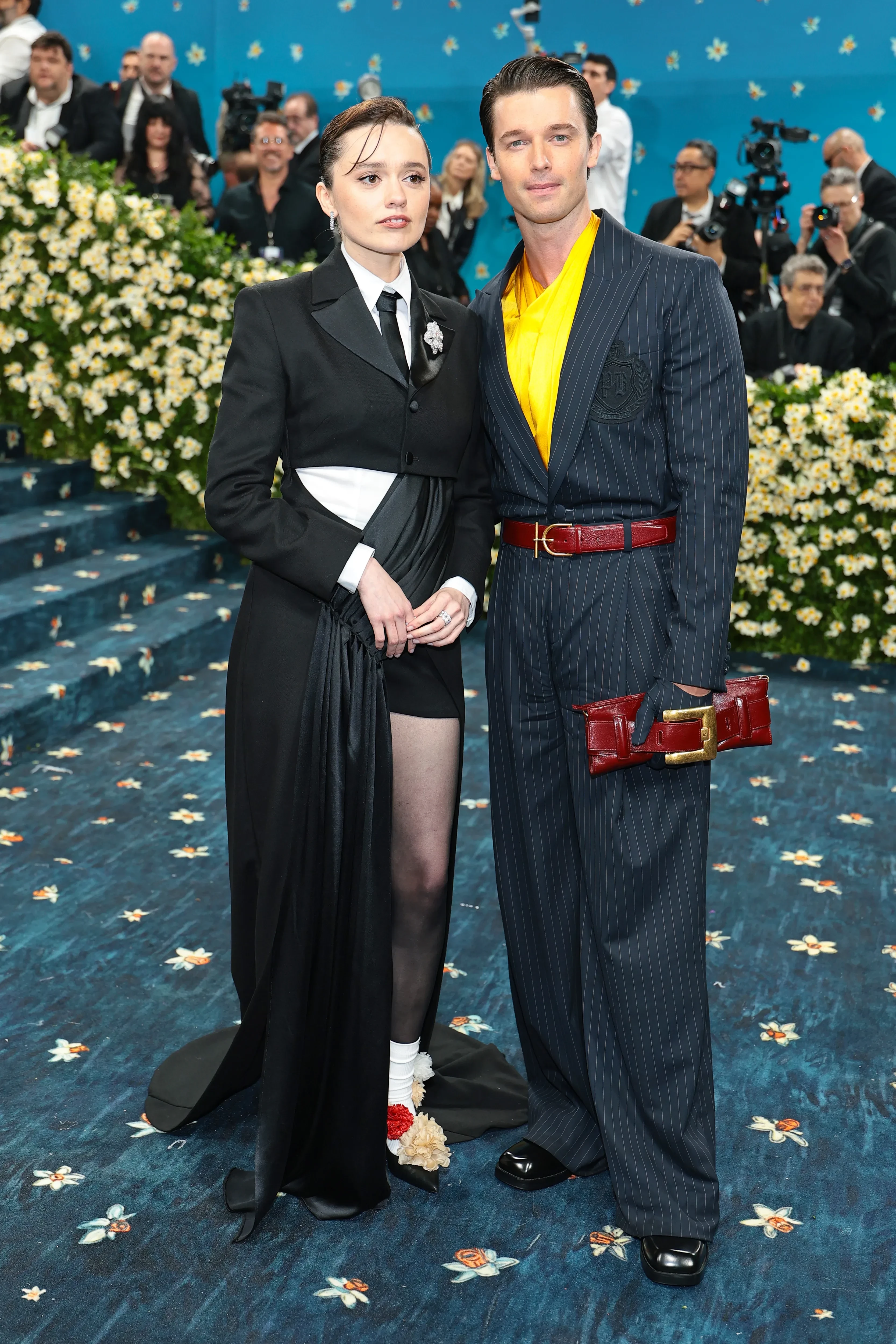 Лора Харриер в Gap Studio (Zac Pozen)Николь Кидман в BalenciagaНиколь Кидман в BalenciagaКендалл Дженнер в TorishejuBad Bunny в PradaАктриса Зои Салдана надела чёрно-белый образ Thom Browne, а Лана Дель Рей пришла не в компании мужа, как надеялись фанаты, а с другом, креативным директором Valentino Алессандро Микеле, и в платье его творчества с кружевом на спине и огромным пером. Ещё один гармоничный парный лук показали звёзды "Белого лотоса" Эми Лу Вуд и Патрик Шварценеггер. Блогерша Эмма Чемберлен позировала в стиле "офисной сирены" в Courreges, а Палома Эльсессер добавила красок этому вечеру в платье Ferragamo с перьями с меховой накидкой.