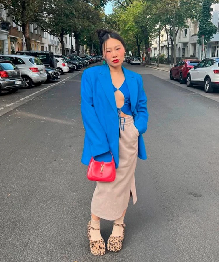 Стиль Ян Гэ смело можно назвать эксцентричным, но мне многие ее образы нравятся. Вот и этот лук — вроде бы сочетание несочетаемого, но какая роскошная цветовая гамма. Синий топ-«шторку» и такого же цвета жакет певица и актриса скомбинировала с бежевой трикотажной юбкой. А далее разбавила лук акцентами — алой сумкой Gucci и меховыми леопардовыми туфлями в сочетании с нюдовыми носками. Губная помада в тон сумки, серьги с зелеными камнями и небрежная укладка. Ярко и стильно!