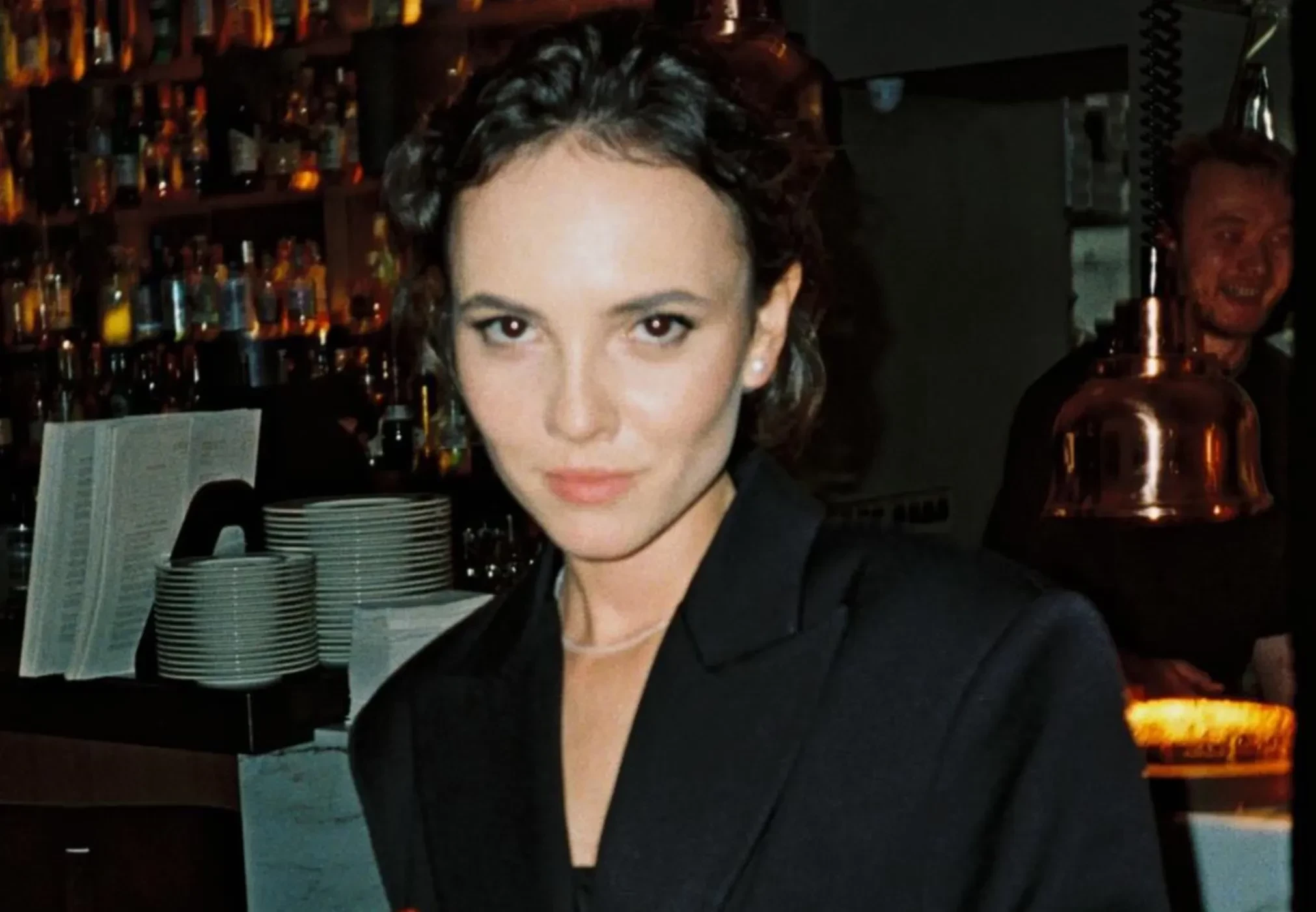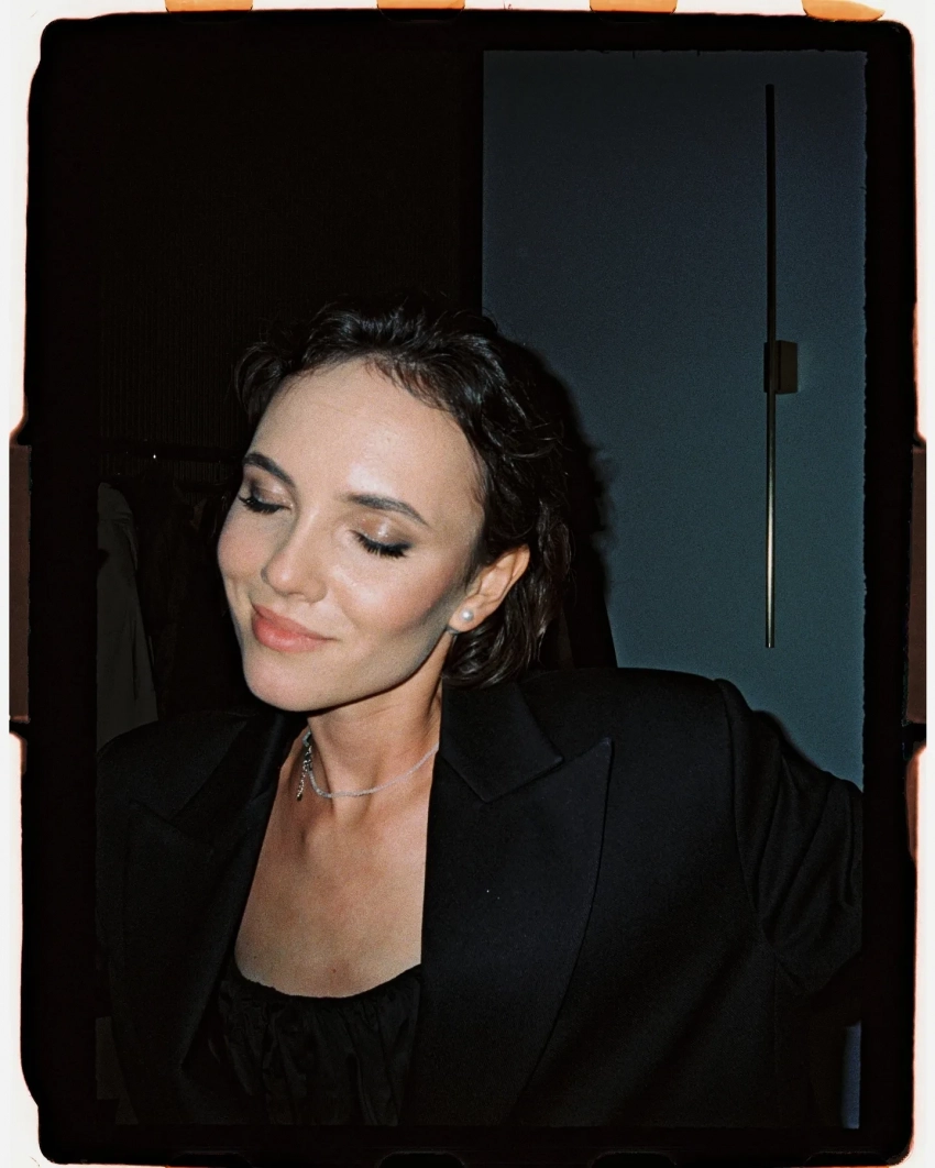 Стася МилославскаяДля праздничного вечера Стася выбрала чёрное мини-платье, накинув сверху оверсайз-пиджак с декоративными рюшами, имитирующими трендовую юбку-баллон. Образ она дополнила чёрными лоферами, а волосы уложила в "мокром" стиле.