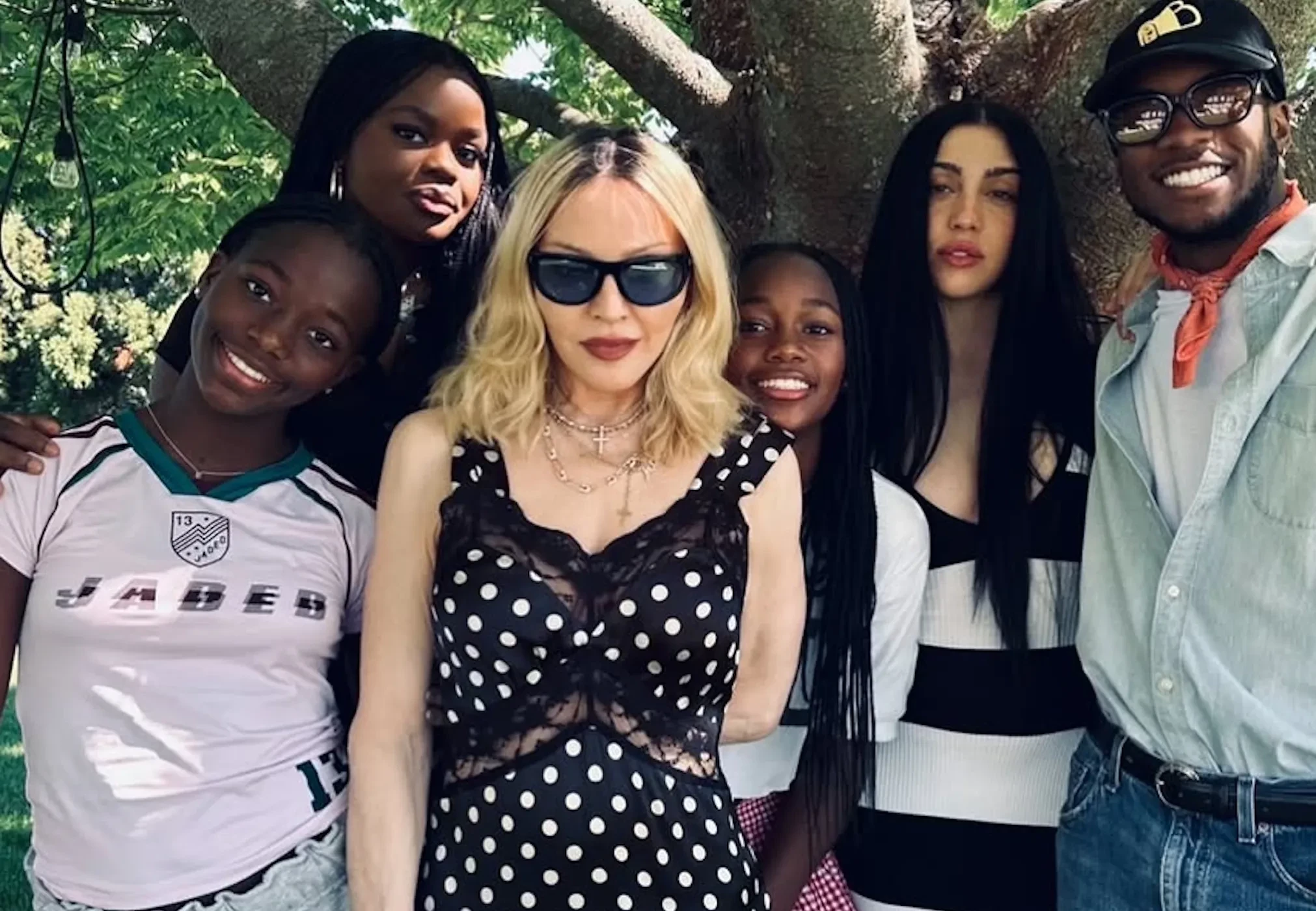 На кадрах звезда позирует на природе в чёрном платье в горох вместе с 28-летней дочерью Лурдес от Карлоса Леона, а также с приёмными детьми: 19-летним Дэвидом Бандой, 19-летней Мерси и 13-летними близнецами Стеллой и Эстер. 24-летний сын Рокко от брака с Гаем Ричи пропустил семейное торжество.