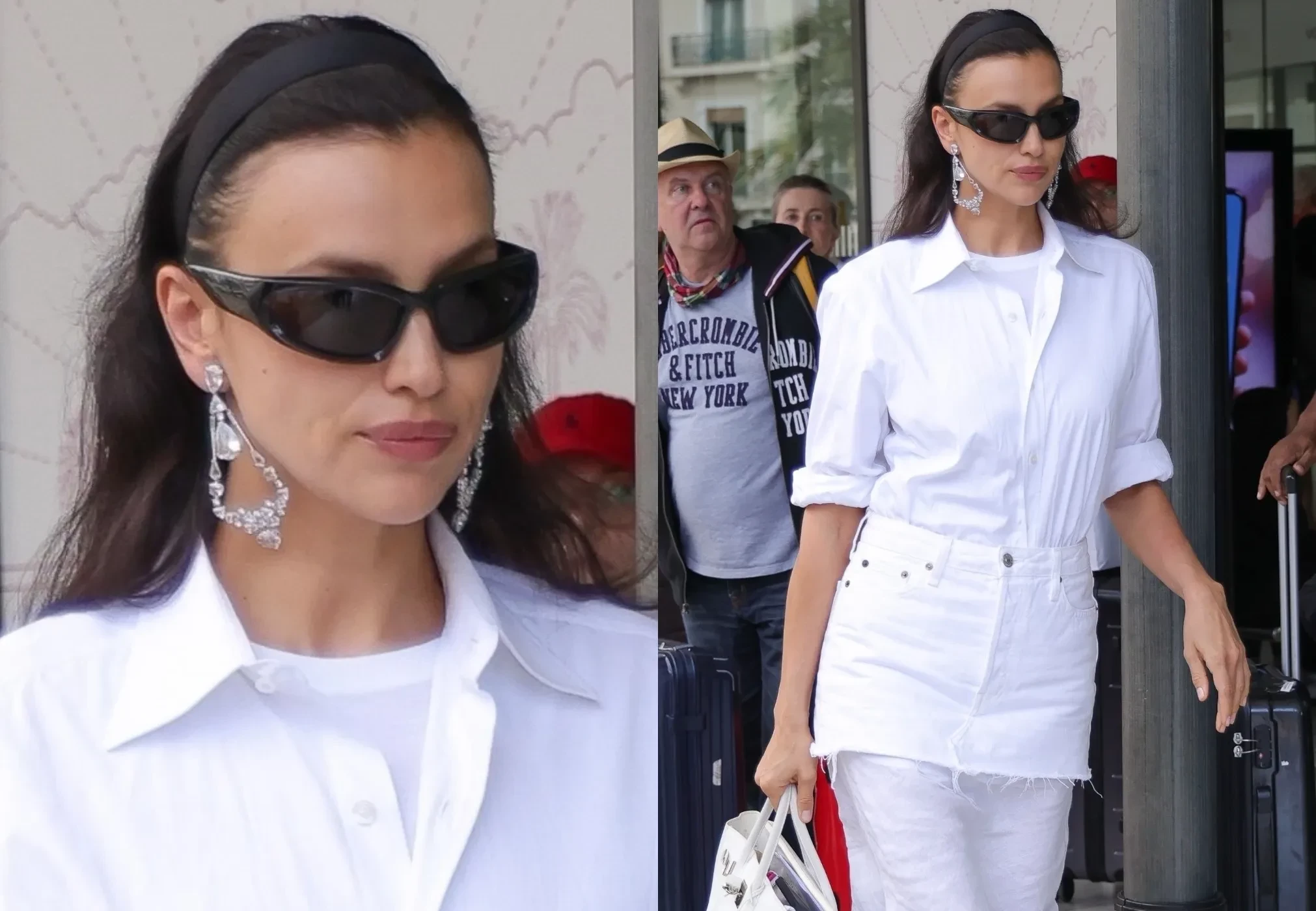 Ещё два года назад Ирина прогуливалась в Каннах в прозрачном платье Gucci, но в этот приезд звезда оделась скромнее. Она появилась перед фотографами в белом многослойном образе, надев длинную юбку с футболкой, рубашкой и джинсовой мини-юбкой поверх, а также в плюшевых балетках, массивных серьгах с бриллиантами и солнцезащитных очках. Образ модели дополнили сумка Hermes Birkin в тон и чёрный обруч на голове.