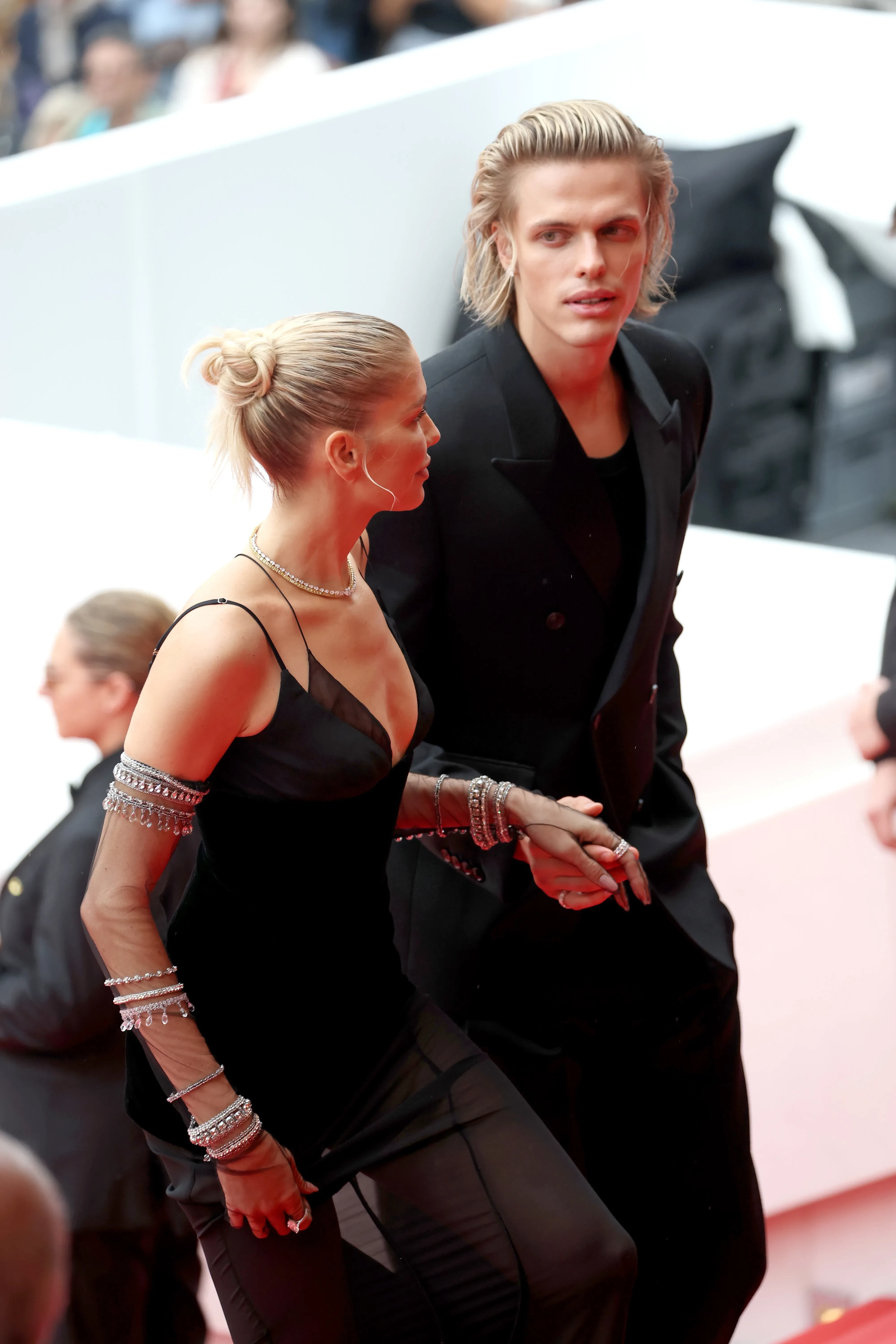 Для выхода в свет модель выбрала черное платье в пол Ulyana Sergeenko. Тарас также был в черном. Он держал возлюбленную за руку, помогая ей подняться по лестнице. Примечательно, что многие журналисты перепутали Романова с актером Мэттью Греем Гублером и подписали фотографии с ним чужим именем.
