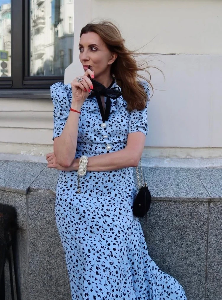 Светлана также выбирает нежное летящее платье с цветочек, но голубого оттенка. Наряд ретро-фасона с рукавами-фонариками декорирован жемчужными пуговицами и бархатным воротником в виде банта. Платье Бондарчук дополняет жемчужным браслетом и миниатюрным бархатным клатчем. Получился элегантный образ с романтичным настроением. Так можно пойти в театр или ресторан.