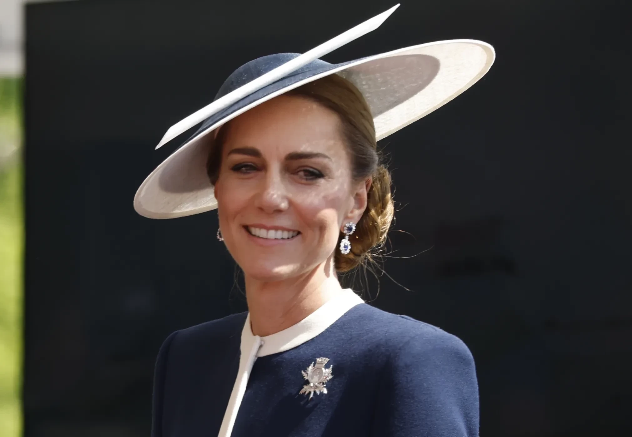 Для официального мероприятия принцесса Уэльская выбрала "морской" образ: синее платье бренда Suzannah London и шляпку Philip Treacy, которую ранее уже надевала на парад в честь платинового юбилея королевы Елизаветы II в июне 2022 года. Наряд дополняли бежевые лодочки Gianvito Rossi, брошь в виде чертополоха и серьги с сапфирами — свадебный подарок от принцессы Дианы. Принц Уильям, как и всегда, появился в классическом костюме.