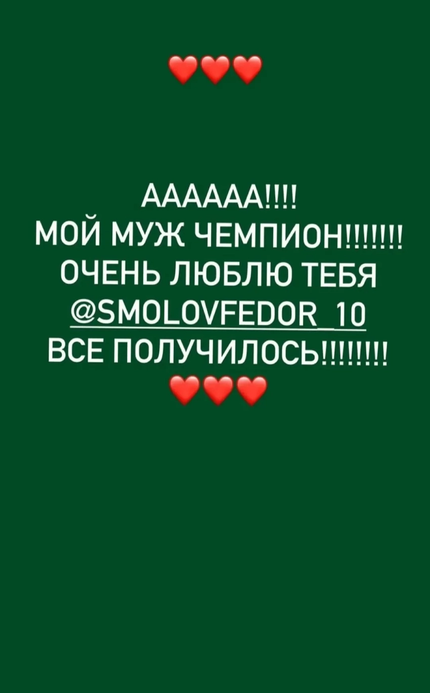 Напомним, что одним из игроков “Краснодара” является Федор Смолов. Он уже опубликовал в соцсетях фото с золотой медалью. А его жена Карина Истомина публично поздравила его: “Мой муж — чемпион! Очень люблю тебя! Все получилось!”.
