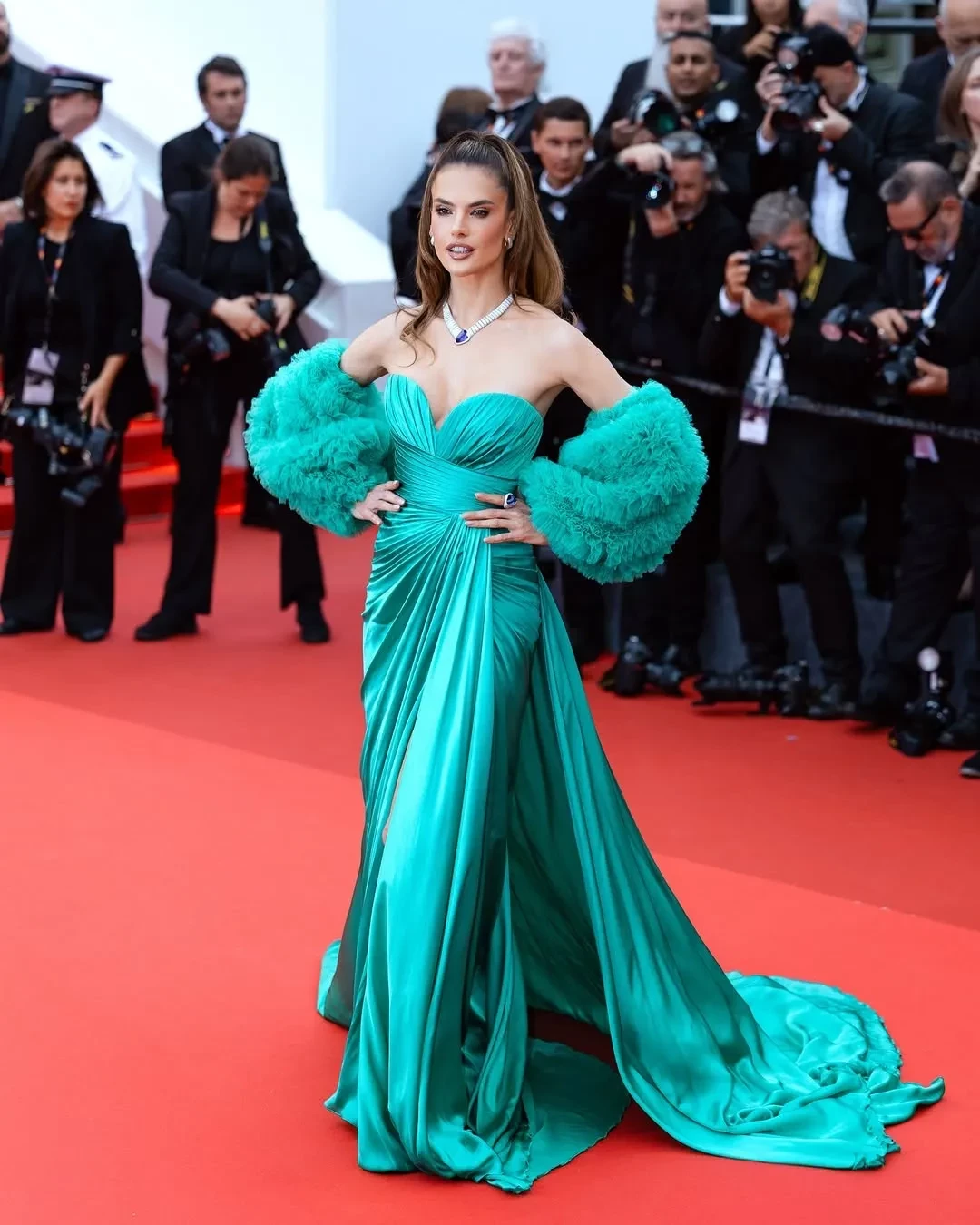 Алессандра Амбросио появилась на церемонии открытия в зелёном платье Zuhair Murad. В образе супермодели плохо всё: цвет, крой и посадка платья, особенно в сочетании с неактуальной причёской и колье с фиолетовым камнем. Ещё один неудачный образ на открытии был у Ирины Шейк. При всей любви к российской модели кажется, что её пышное платье в горох спасла бы другая укладка, например, распущенные прямые волосы.