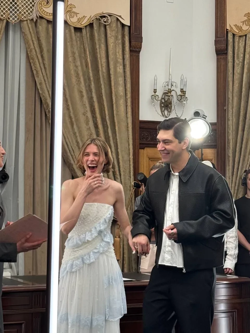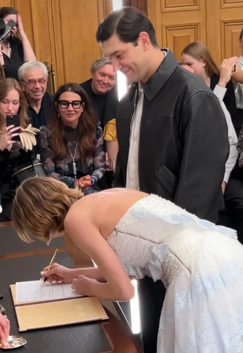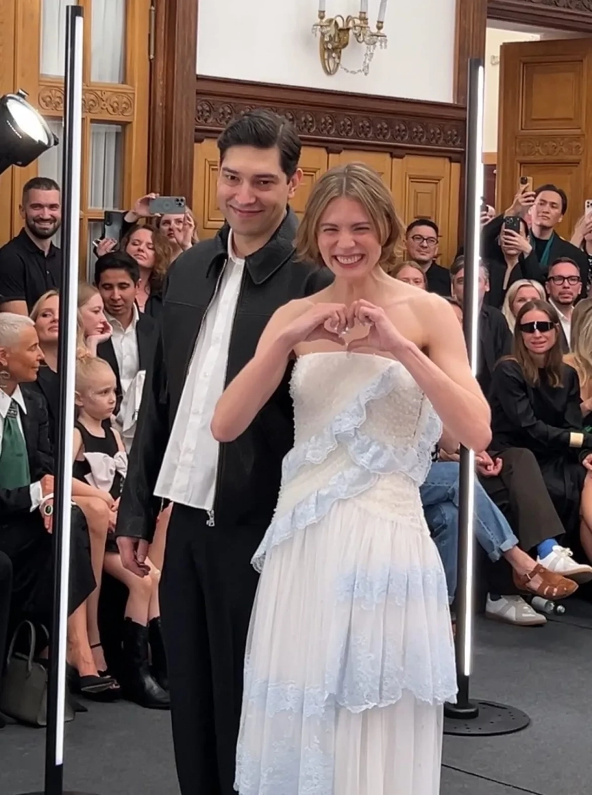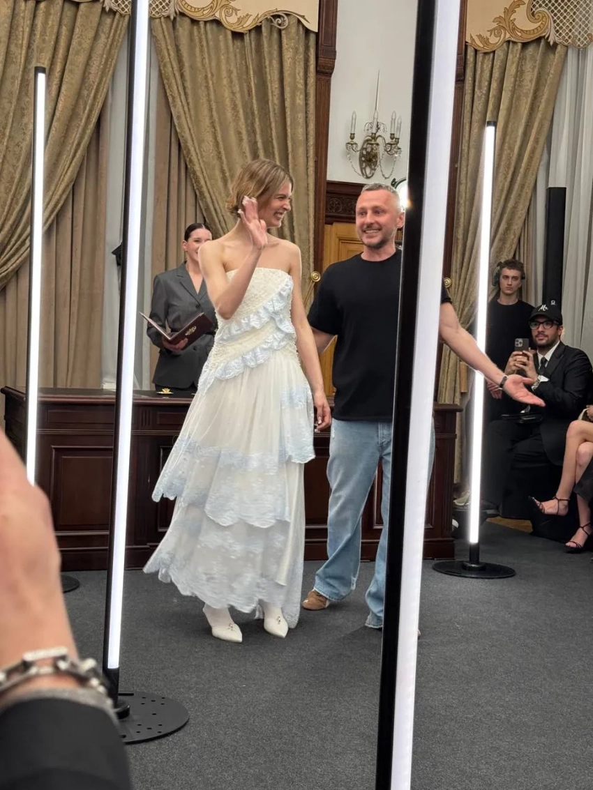 К "алтарю" невесту вёл основатель бренда Андрей Артёмов, а жених в этот момент сидел в первом ряду рядом с Ксенией Соловьёвой. Гости показа до последнего не понимали, что станут свидетелями реальной свадьбы, пока сотрудница ЗАГСа не начала говорить официальную речь.