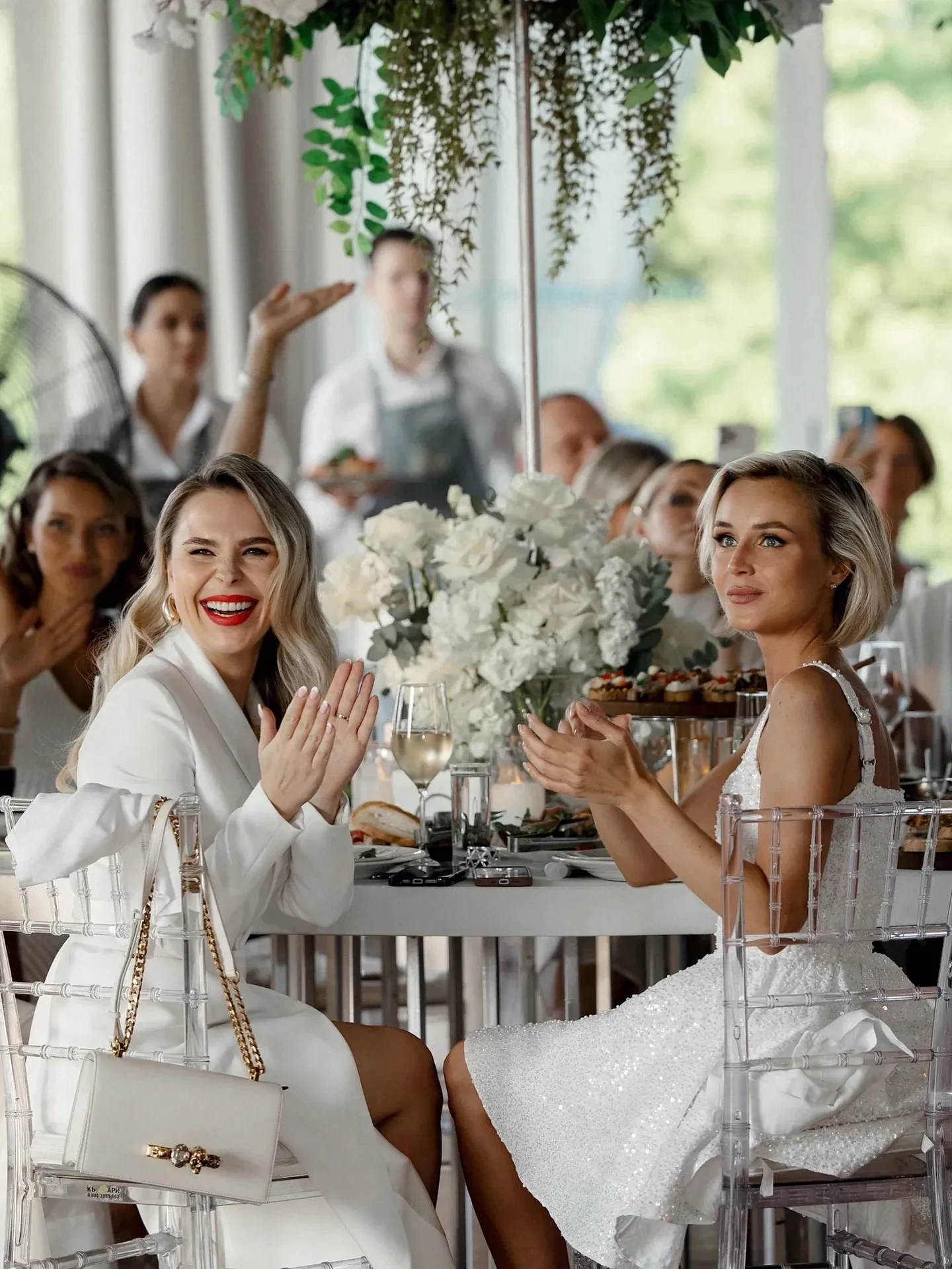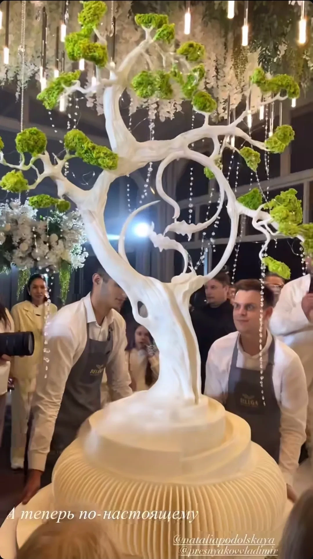Пелагея и Полина ГагаринаПосле всех выступлений супруги предложили гостям свадебный торт. Однако сначала они разыграли всех: официант уронил торт, однако оказалось, что он был фейковым. После этого гостям представили настоящий торт в форме дерева.