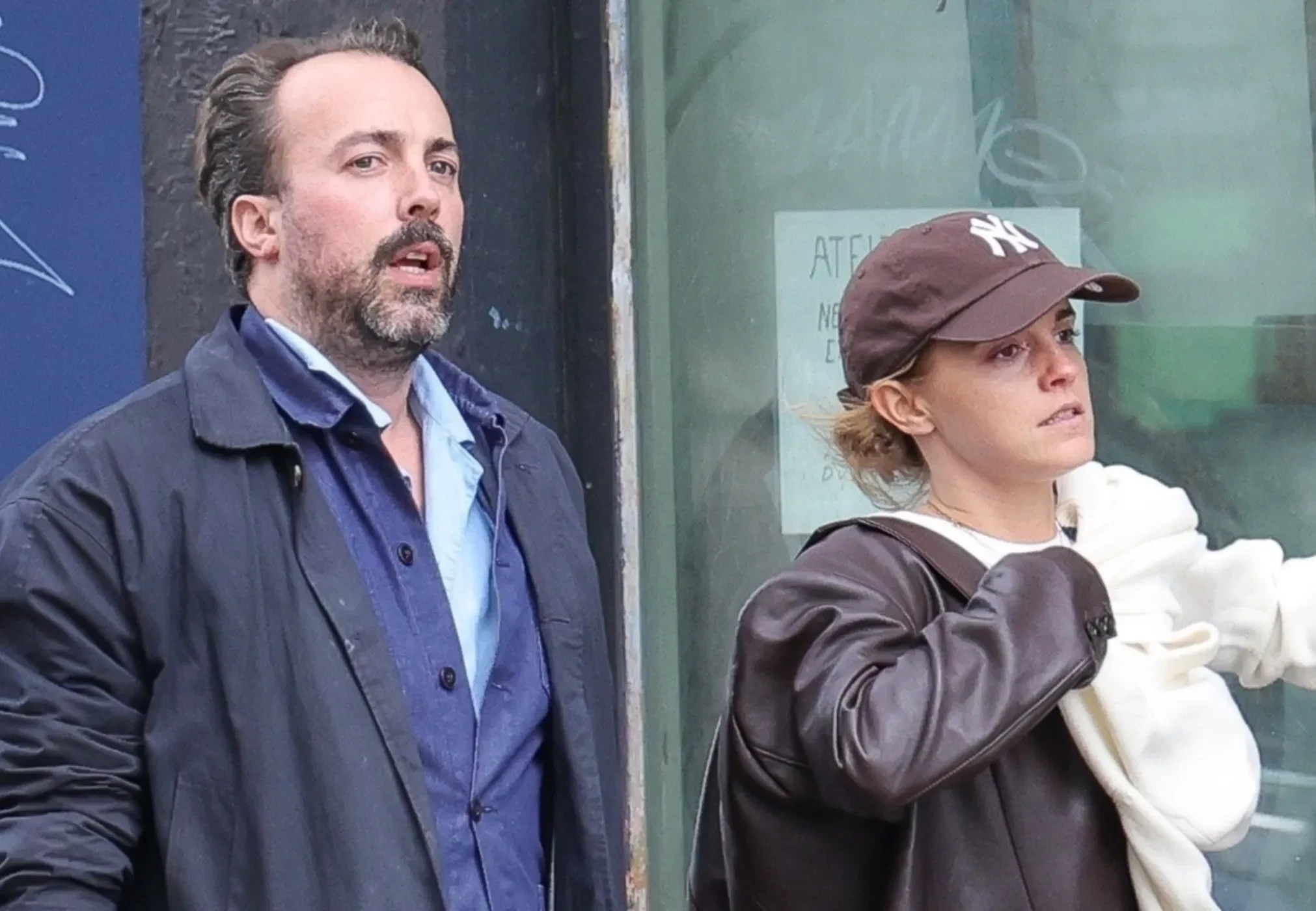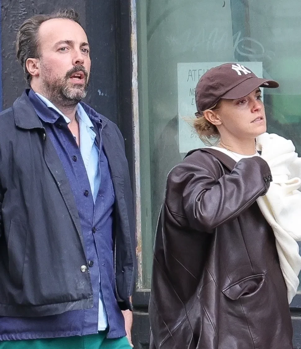 Для выхода на публику 35-летняя актриса выбрала коричневую кожаную куртку, надетую поверх белого лонгслива, и свободные джинсы. Её образ дополнили кепка и кеды в тон верхней одежде. Спутник Эммы предстал в неоднозначном наряде: несколько надетых друг на друга рубашек, сверху ветровка, короткие бирюзовые шорты и обувь, напоминающая домашние тапочки.