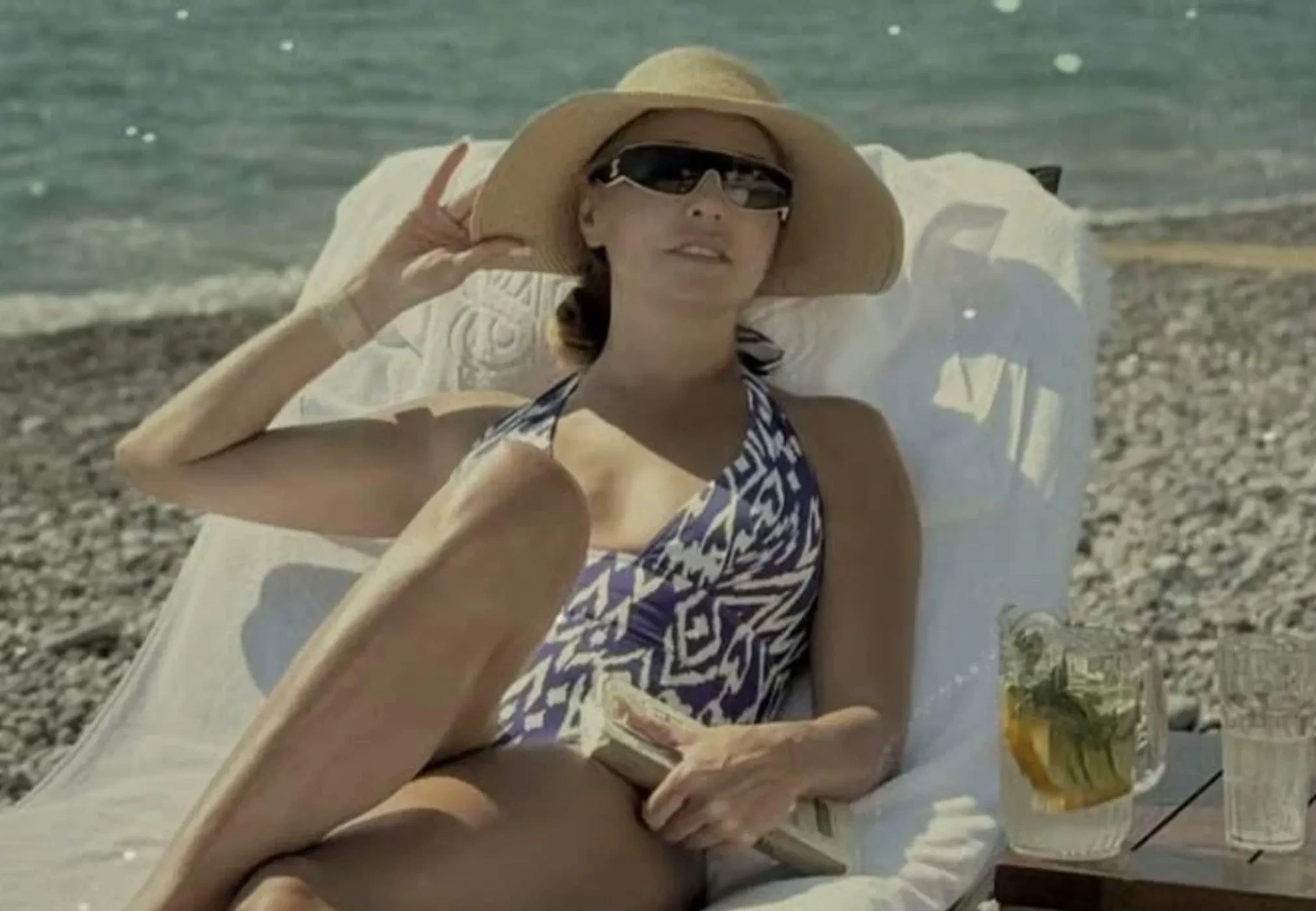 На кадрах можно увидеть, как Татьяна загорает на пляже в купальнике и позирует перед камерой на фоне декоративных растений, украшающих территорию отеля.
