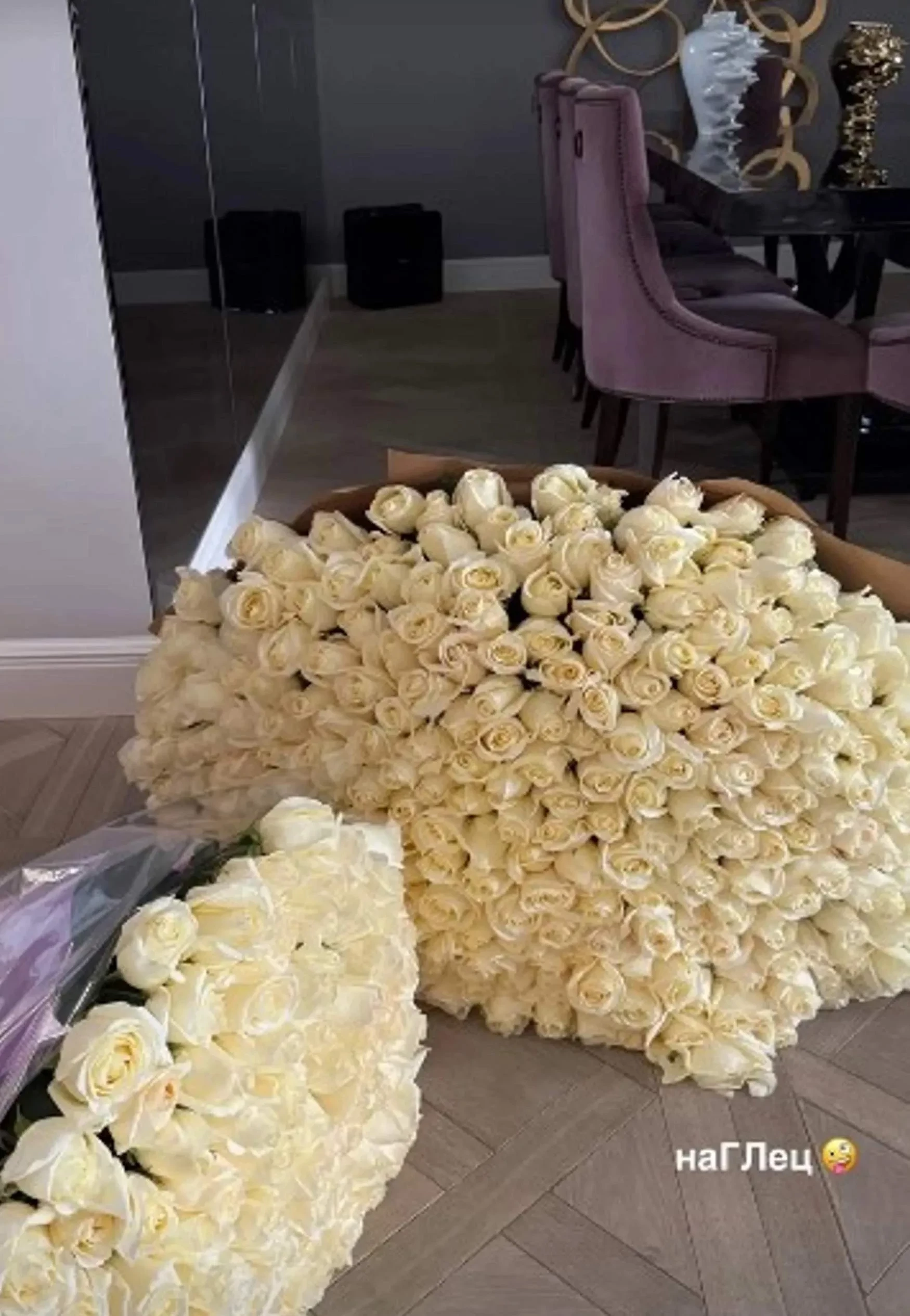 Григорий прислал в подарок Авроре два огромных букета белых роз. Киба сфотографировала их и опубликовала в соцсетях, сопроводив лаконичной подписью: “Наглец”. Позже она записала видео, где демонстрировала подаренные ей цветы под звук со словами: “Любовь спасет нас всех, любовь — это главное”.