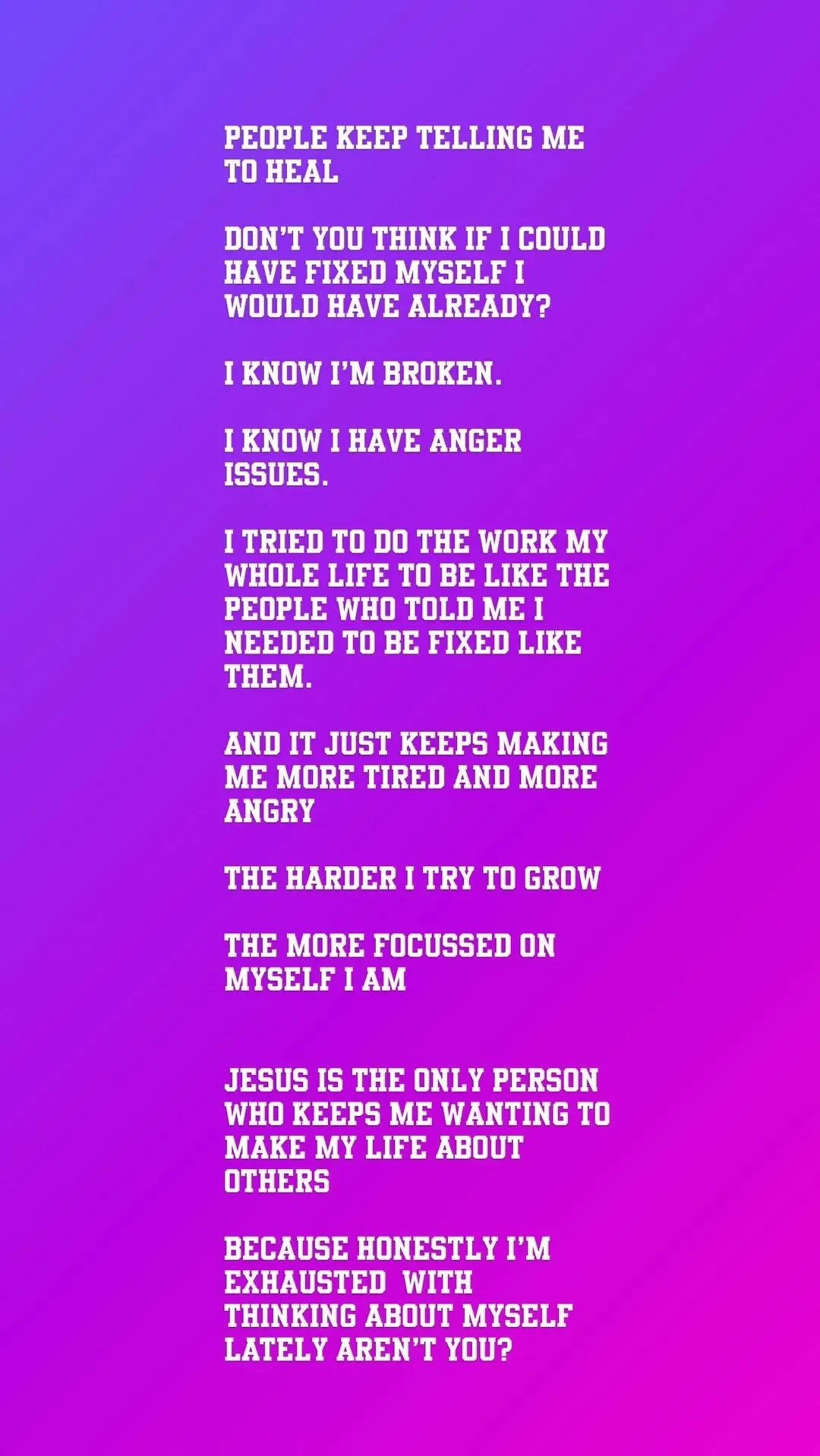 Так, в публикации 31-летний певец рассказал о своём нестабильном психическом состоянии, подтвердив догадки поклонников. "Люди говорят мне, что мне нужно подлечиться. Но вы не думали о том, что если бы я мог "починить" себя, я бы давно это сделал? Я знаю, что сломан. Я знаю, что у меня проблемы с гневом", — поделился он. Джастин отметил, что борьба с самим собой даётся ему тяжело и зачастую лишь усугубляет ситуацию: "Я всю жизнь пытался работать над собой, чтобы быть более похожим на тех, кто говорил, что мне нужно починить себя, и это только делает меня ещё более уставшим и ещё более злым. Чем сильней я пытаюсь меняться, тем больше я замыкаюсь в себе". При этом, по словам Бибера, единственной опорой для него является вера: "Только Иисус поддерживает во мне желание жить ради других. Потому что, если честно, в последнее время я устал думать только о себе".