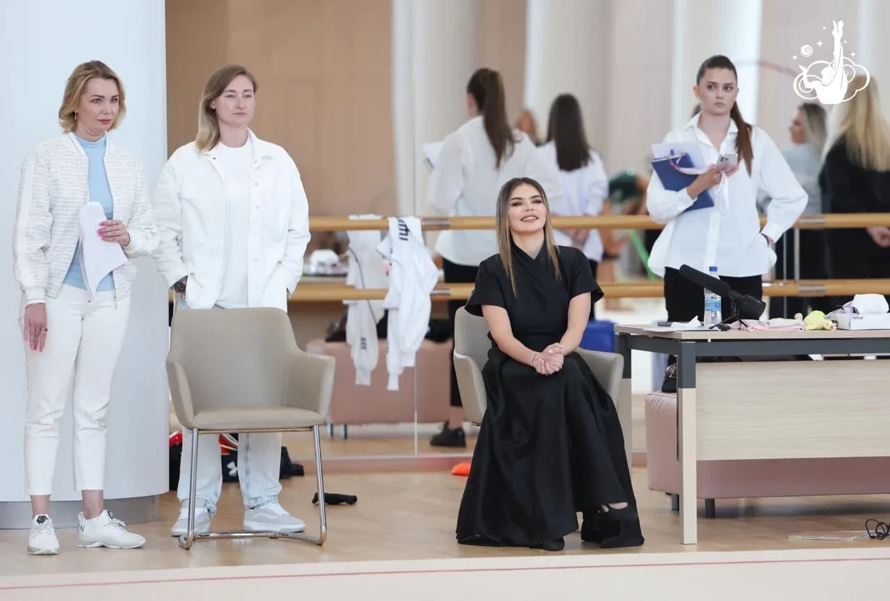 На мероприятии 42-летняя Кабаева появилась в чёрном платье в пол. Она следила за выступлениями юных гимнасток и помогала своим воспитанницам подготовиться к выходу.