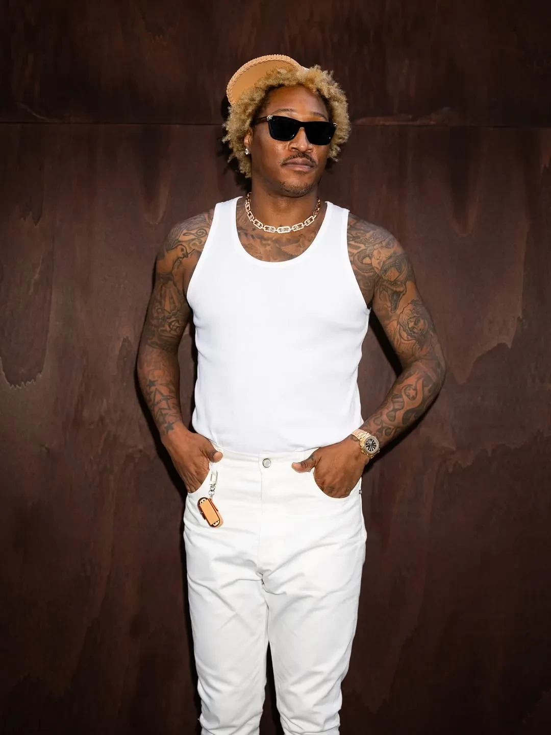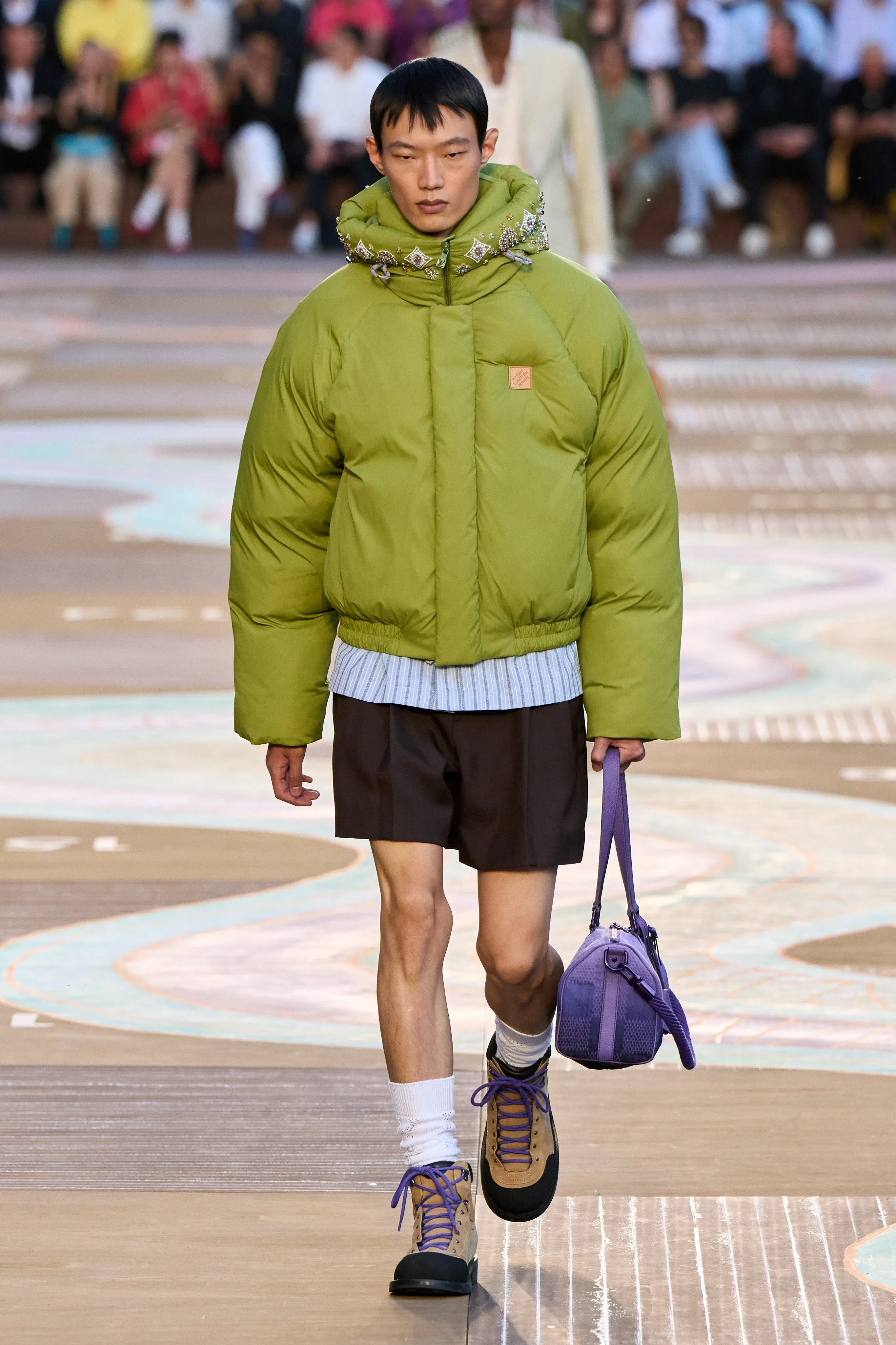 A$AP NastПоказ летней мужской коллекции Louis Vuitton прошёл в парижском центре искусств и культуры Помпиду. На её создание 52-летнего Фаррелла Уильямса вдохновила поездка в Индию. Модели выходили на подиум в образах с принтами пальм, антилоп, зебр и других животных, в пуховиках с вышивкой бисером и драгоценными камнями, а ярким акцентом в коллекции стали сумки в виде лягушек и с анималистичными принтами.