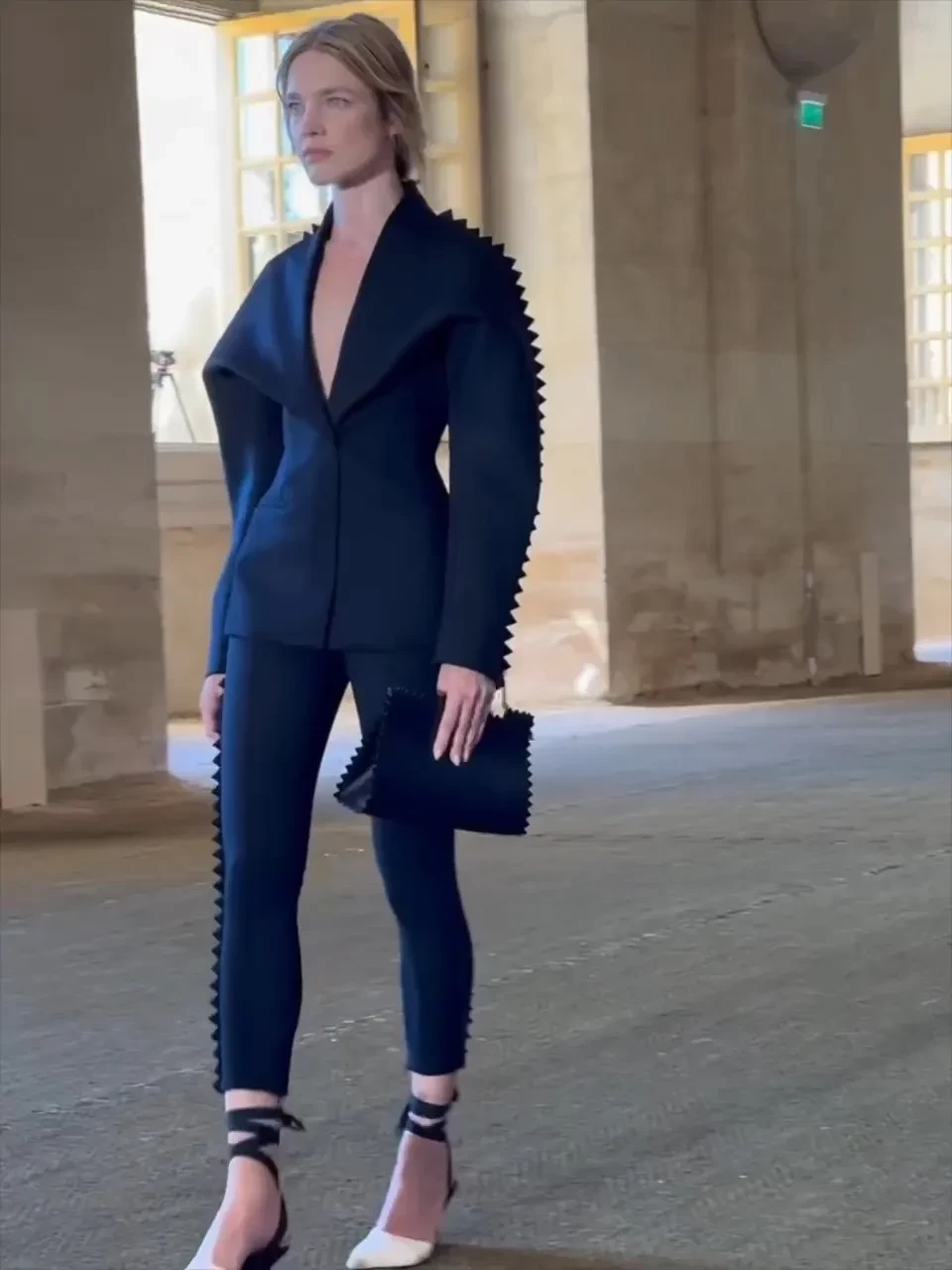 https://t.me/spletnik2006/34217На показе она появилась в приталенном блейзере с глубоким декольте, а также в брюках с декоративными зубчиками по бокам.