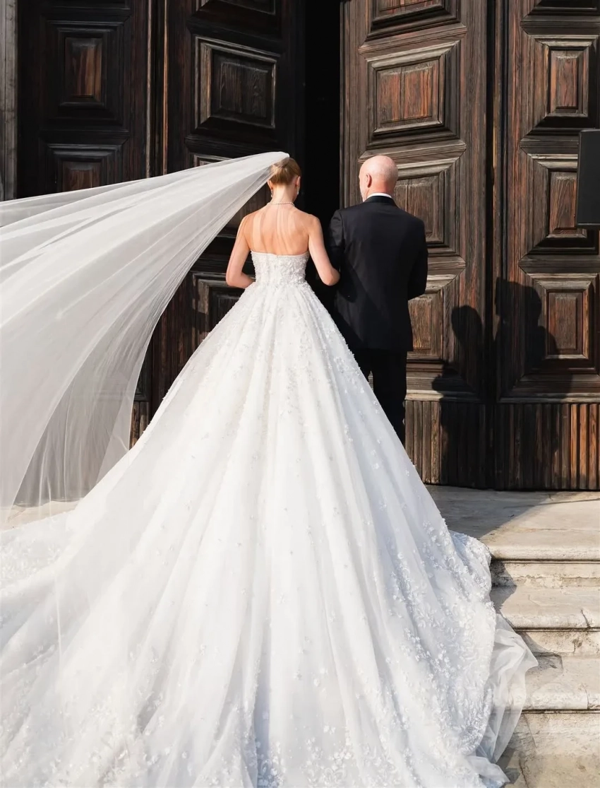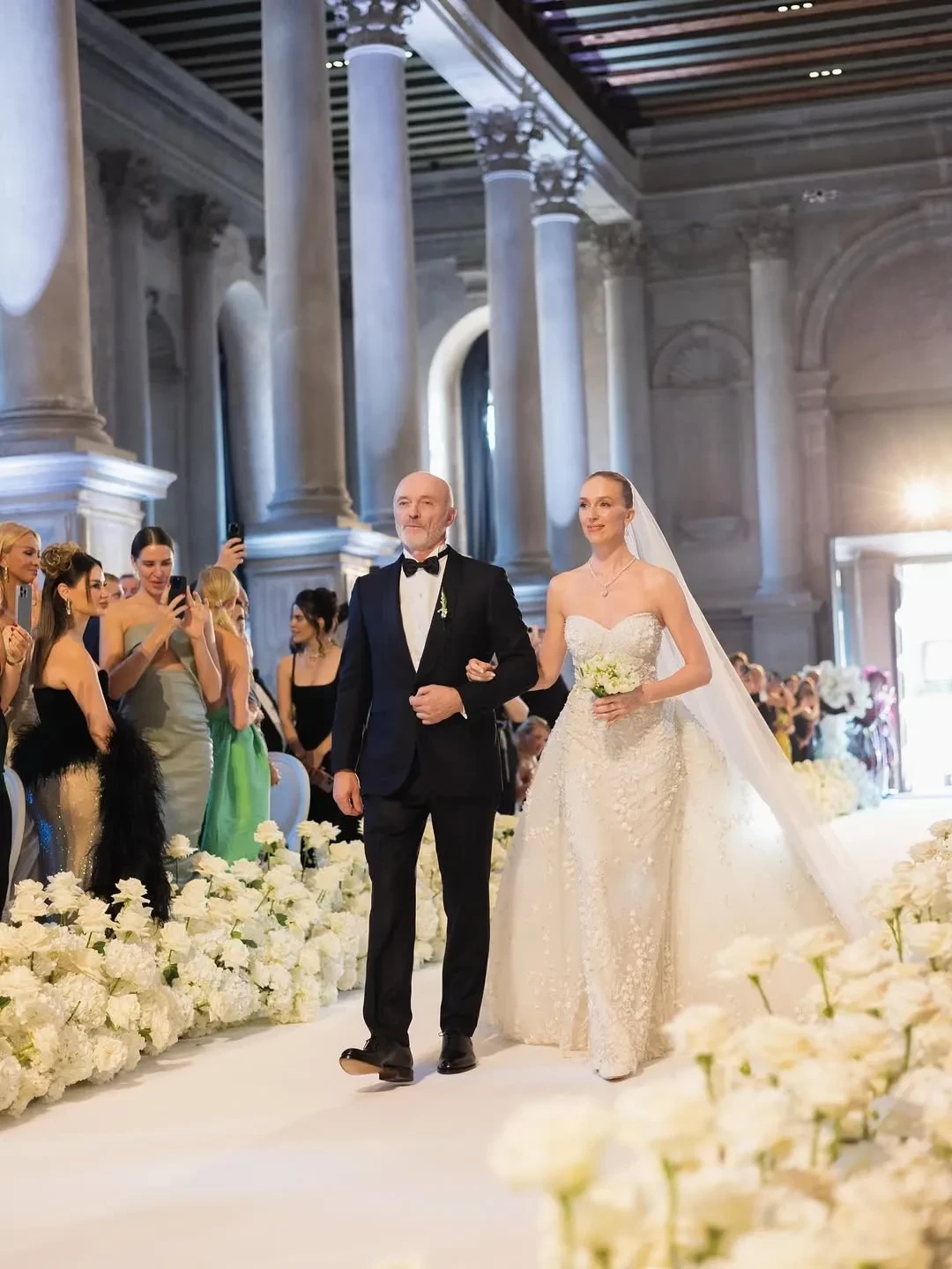 Невеста с отцомВ Венецию специально прилетели шеф-повара альянса Бориса Зарькова White Rabbit Family (WRF). Для праздника, как рассказала Ирина Зарькова, заказали 46 килограммов икры, тысячи живых цветов, четыре автобуса шаманского из Франции и организовали лодки для 170 гостей, а платье невесты от Georges Hobeika шили почти год.