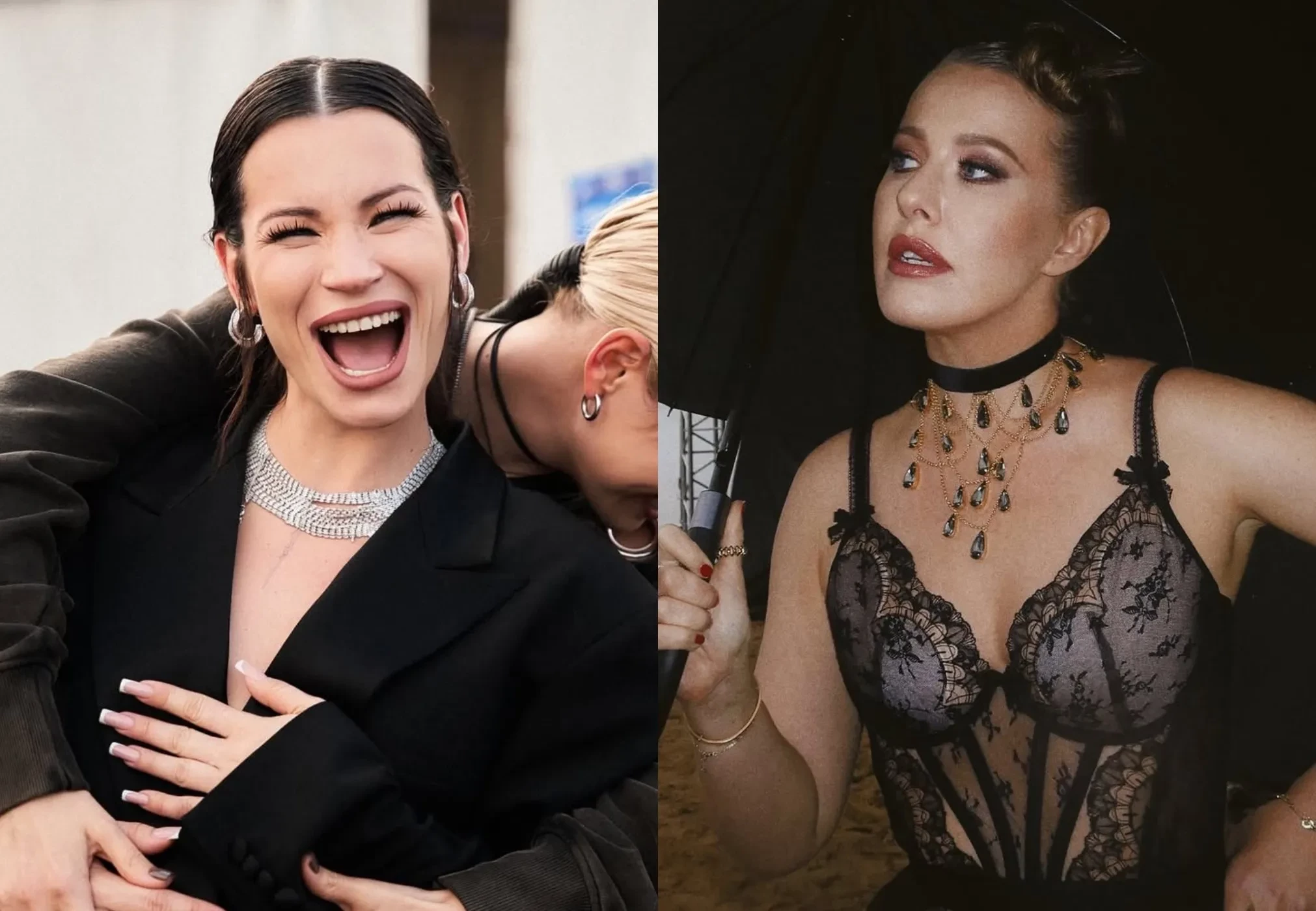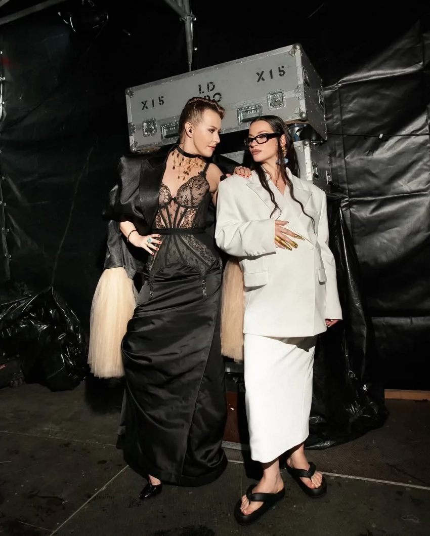 Ида Галич и Ксения СобчакКсения Собчак, за стиль которой отвечает модный столичный дуэт Миша и Китти, выходила на сцену в "фантастическом русском кутюре", как она назвала свой образ Viva Vox с костюмной серой юбкой, а также в кружевном корсете Agent Provocateur, юбке Ushatava и колье от Ульяны Сергеенко.