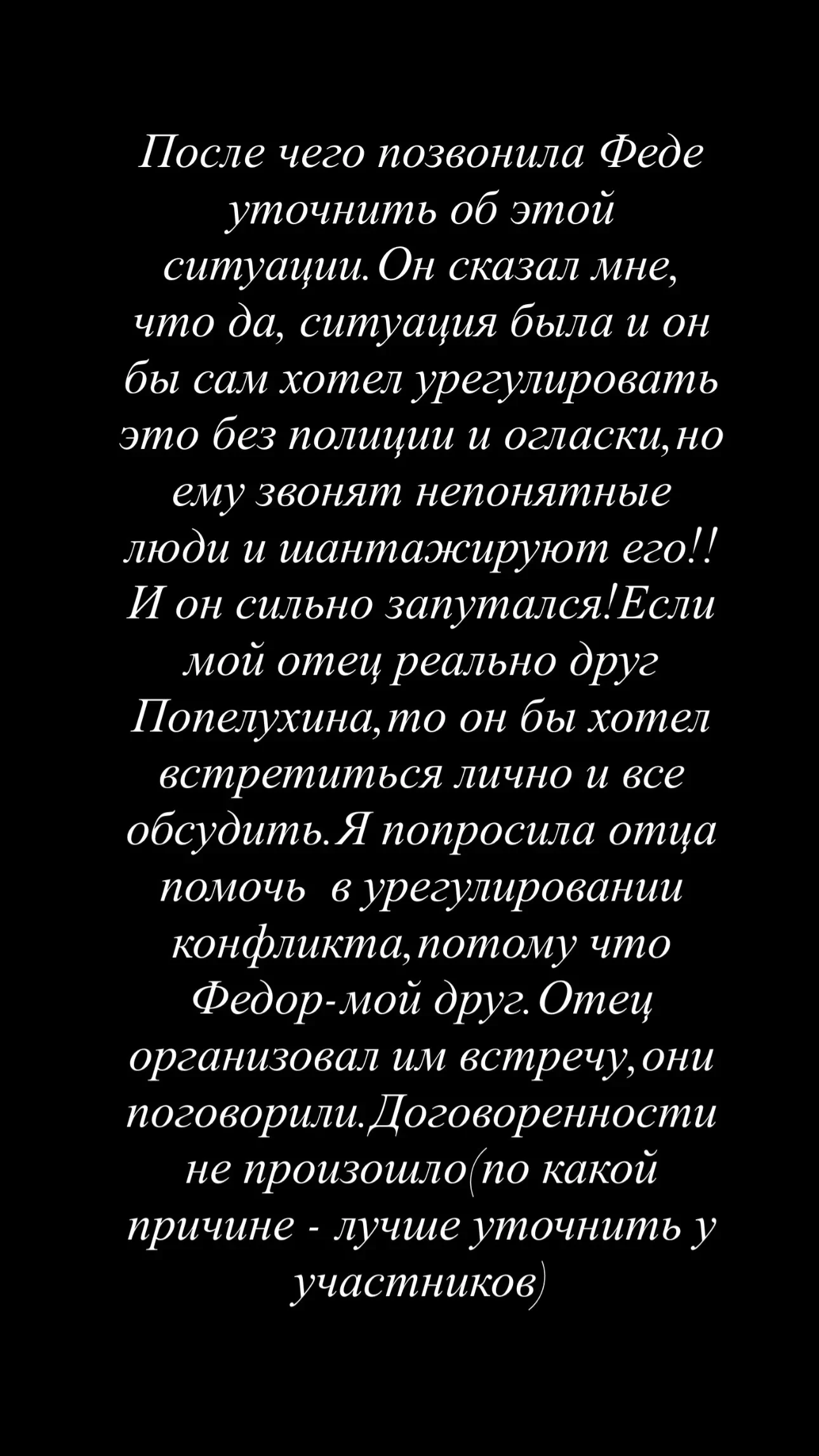 Фёдор СмоловПо её словам, спортсмен выразил готовность обсудить ситуацию напрямую, если отец Дарьи действительно знает Попелуху: "Я попросила отца помочь в урегулировании конфликта, потому что Фёдор — мой друг. Отец организовал им встречу, они поговорили. Договоренности не произошло (по какой причине — лучше уточнить у участников)".