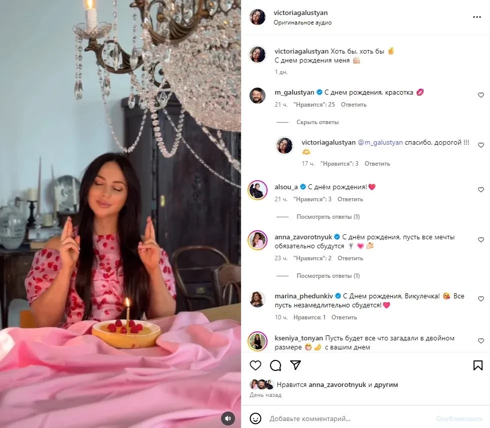 Бывшая жена Михаила Галустяна отпраздновала 39-й день рождения и выложила в соцсетях ролик, где задувает свечку на праздничном торте, а женский голос за кадром желает ей "любви, но только такой, чтобы она была здоровая, взаимная, чтобы он был богатый, красивый, молодой обязательно". "Хоть бы, хоть бы. С днём рождения меня", — подписала видео Виктория.