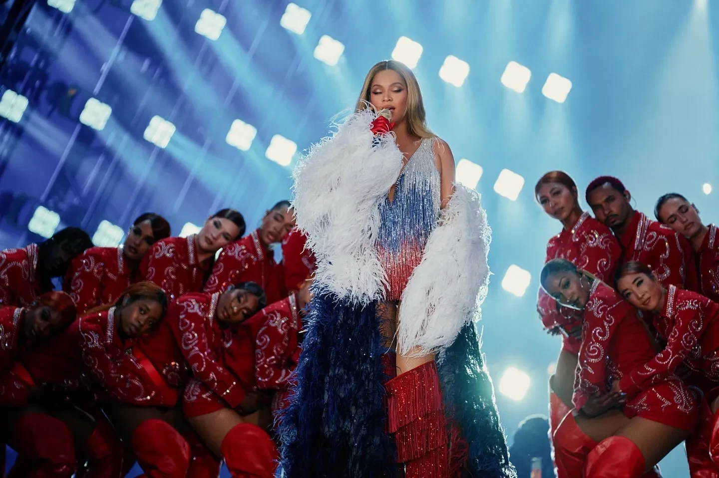 На снимках 43-летняя Бейонсе запечатлена во время концерта: она выступала в боди в бело-сине-красном цвете. Несмотря на то что, скорее всего, её наряд был отсылкой к американскому флагу, русскоязычные подписчики оставили много комментариев под фото: "Ждём фит с Шаманом", "Мы русские, с нами Бейонсе", "У Шамана конкуренты на Интервидении", "Ждём кавер на "Матушка-земля", "За такое можно ей и звание народной артистки дать".