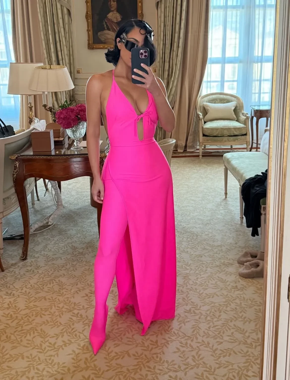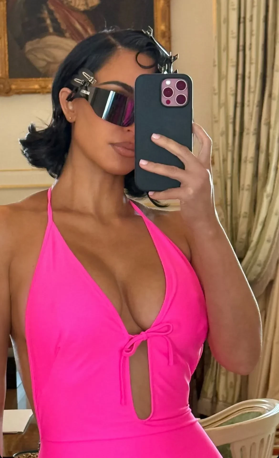 Ким Кардашьян прилетела в Париж на Неделю высокой моды в преддверии последнего показа Демны Гвасалии для Balenciaga. 44-летняя бизнесвумен появилась на публике в тотал-луке бренда цвета фуксии и дополнила образ укладкой в стиле старого Голливуда и солнцезащитными очками.