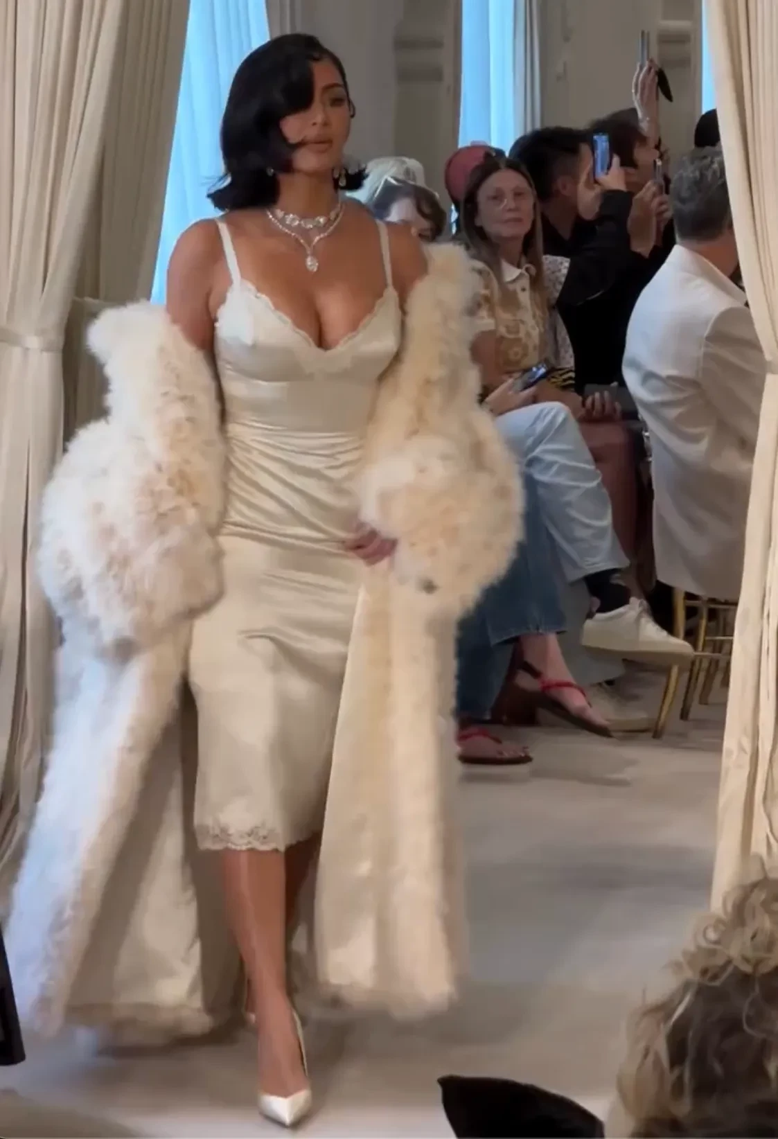 Кардашьян дефилировала в шёлковом платье-комбинации и длинной шубе. Образ дополнило ожерелье с бриллиантами от ювелирного дизайнера Лоррейн Шварц.