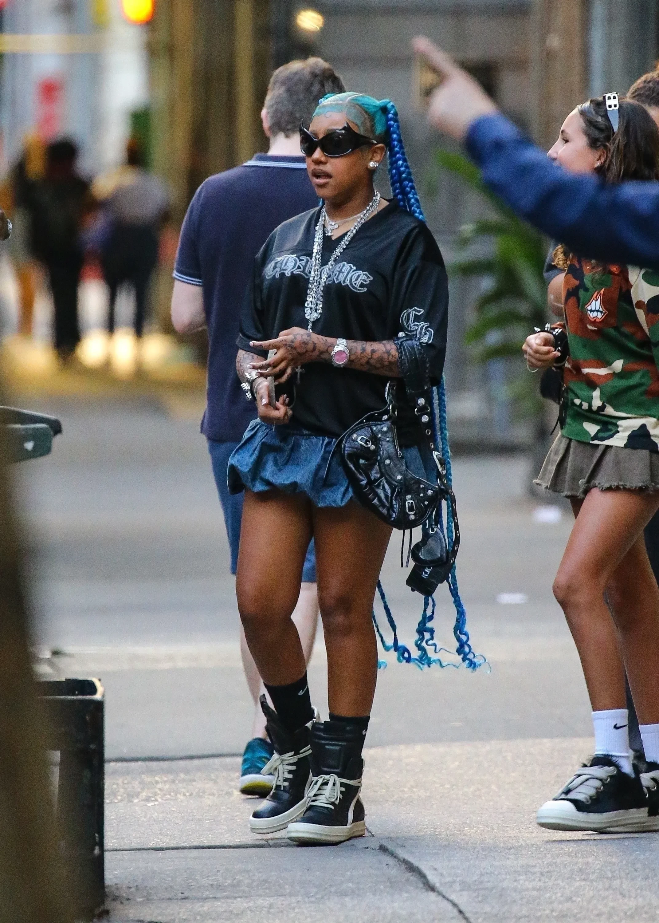 Старшую дочь Ким Кардашьян и Канье Уэста, 12-летнюю Норт, засняли в Нью-Йорке в ярком образе: футболку с принтом и мини-юбку девочка дополнила кроссовками Rick Owens, очками Balenciaga и крупными украшениями, но главным акцентом образа стали длинные синие косы и татуировки, очевидно переводные, которыми были забиты все руки.