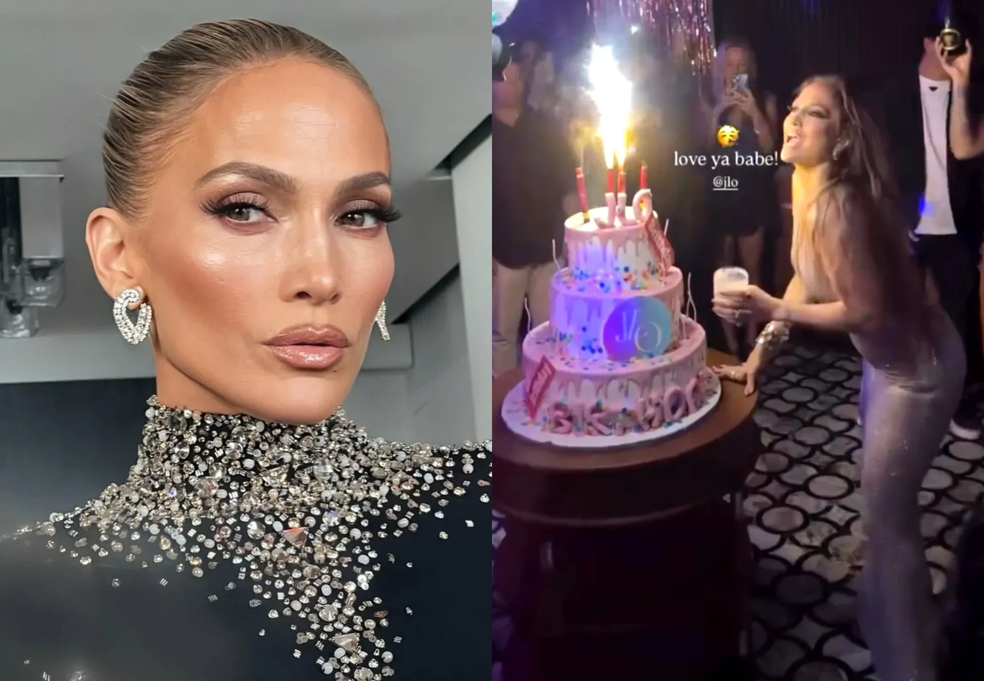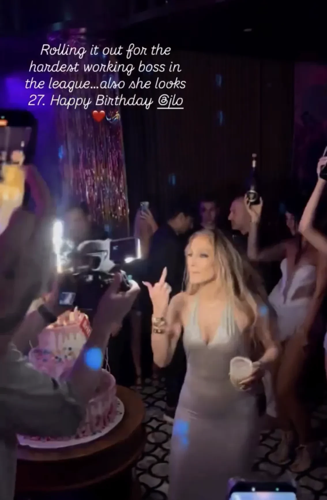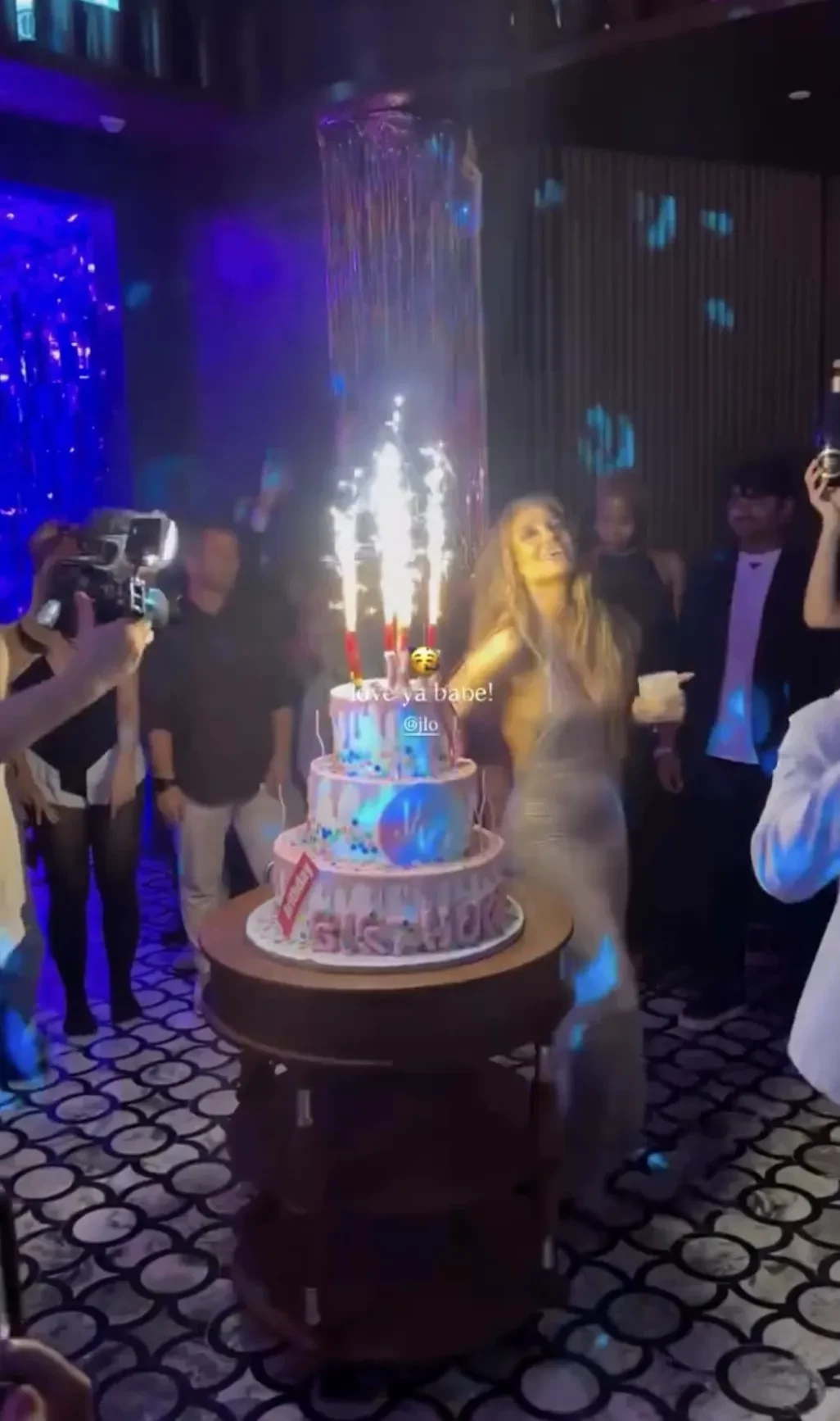 Лопес появилась на празднике в облегающем серебристом платье под свой новый трек Birthday, выпущенный специально ко дню рождения. Певица танцевала вокруг праздничного торта в окружении танцоров, музыкантов и других своих сотрудников.