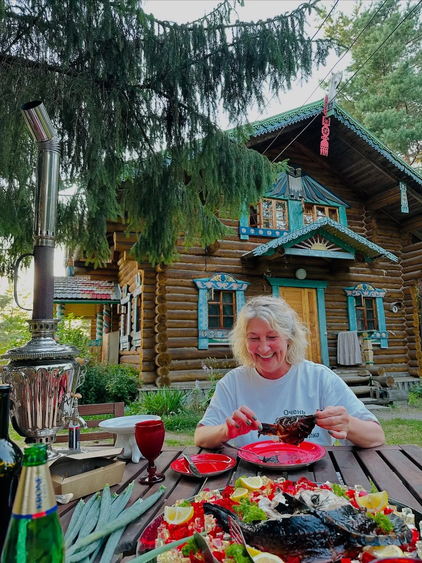 Фотографиями из поездки поделилась в инстаграме* сама Наталья. В подписи к публикации она рассказала, что вся семья отправилась в село, чтобы навестить пожилую родственницу, которой скоро исполнится 90 лет. Также они сходили на кладбище почтить память предков, выбрались на рыбалку и устроили обед на свежем воздухе с осетриной и настоящим самоваром.