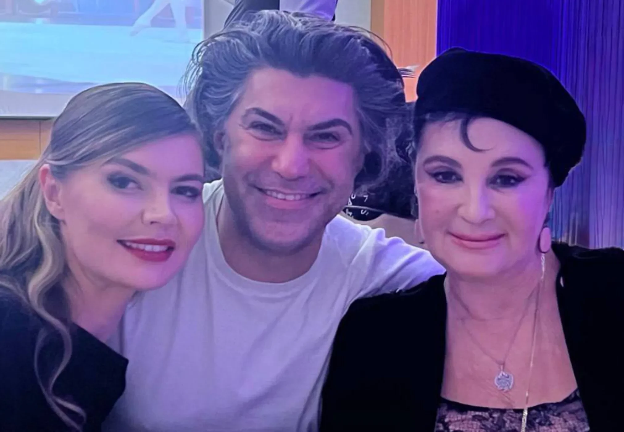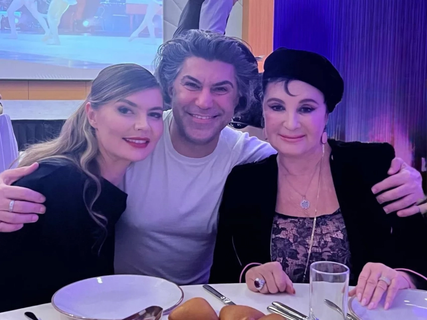На снимке Цискаридзе сидит за столом и с одной стороны обнимает Ирину Винер, а с другой — Алину Кабаеву. Все трое улыбаются и смотрят в камеру.