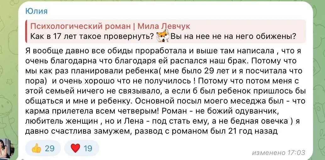 Сообщение Юлии ГольдортЖенщина добавила, что Елена с самого начала старательно "окучивала" Романа и "владеет всеми техниками" манипулирования. "Она пару лет побыла в любовницах, но активно старалась, чтобы жена узнала. Вот почему у них расходится инфа, Лена пишет — 22 года вместе, а он — 19, то есть он брак посчитал, а она всё время вместе".