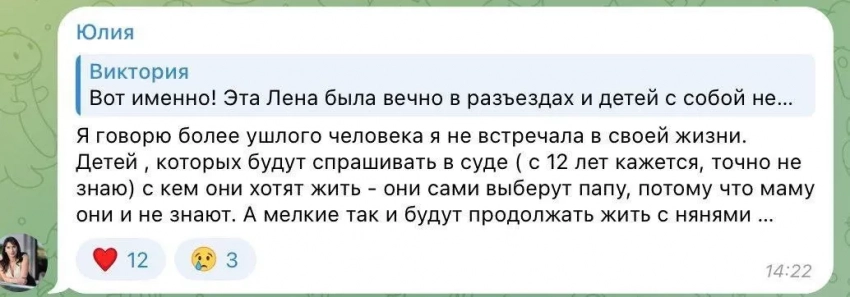 "Я ей очень благодарна, что мы из-за этого развелись и моя жизнь сложилась очень счастливо и подальше от всей этой грязи. Просто все жалеют Лену — бедную, несчастную, но по факту более ушлого человека я не встречала в своей жизни! Что называется — снимаю шляпу", — написала Юлия. Она отметила, что старшие дети Елены и Романа"терпеть её не могут", потому что "кроме родов она никогда ими не занималась".