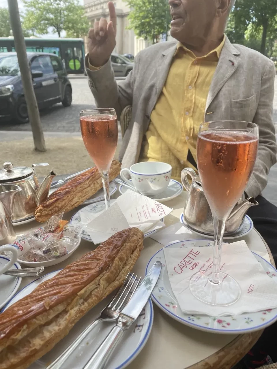 "Я всегда хочу в Париж. Долгие прогулки по набережным, сhausson aux pommes (булочка с яблоком) из кафе Carette — по форме вобла-воблой, а на вкус лучше не бывает, ледяное шампанское, зеленые стулья Люксембургского сада и, конечно, любимый рядом. В общем, romantique в идеальном о нем представлении", — подписала 51-летняя актриса фотографии, на которых позирует на летней веранде любимого кафе и на местной улочке. Она также добавила снимок с мужем и теми самыми булочками.
