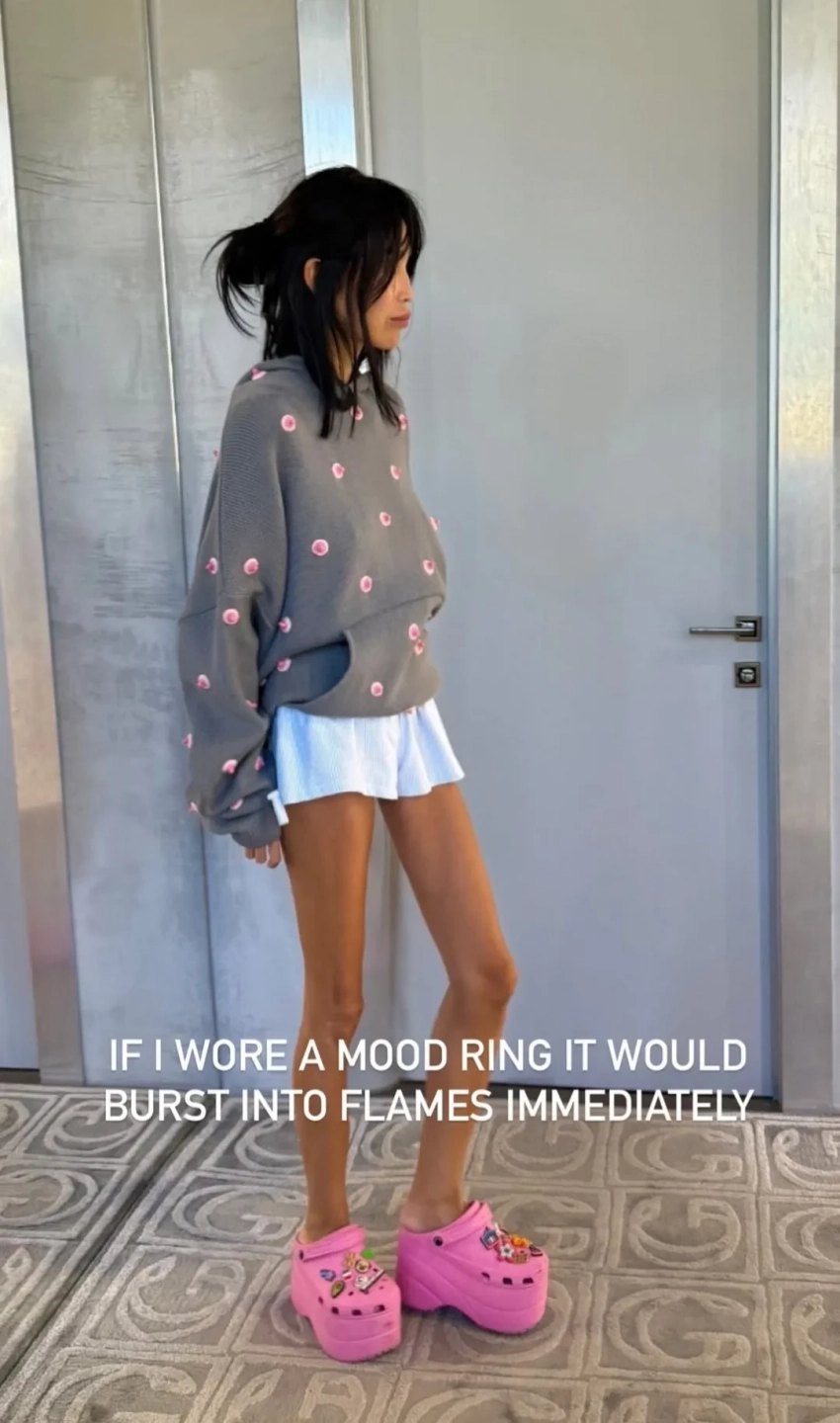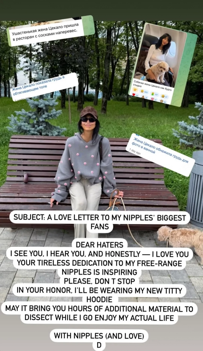 Дарина Эрвин“Это любовное письмо самым большим фанатам моих сосков, — обратилась Эрвин, в том числе, к журналистам, которые пишут статьи о её внешности и узнаваемом стиле, — Дорогие хейтеры, я вас вижу, слышу и, честно, люблю. Ваше неустанная преданность моим свободным соскам вдохновляет. Пожалуйста, не останавливайтесь. В вашу честь я надену сегодня эту худи. Пусть она принесёт вам новый материал, который можно анализировать часами, пока я наслаждаюсь своей жизнью. С сосками и любовью, Ди”, — написала Дарина.