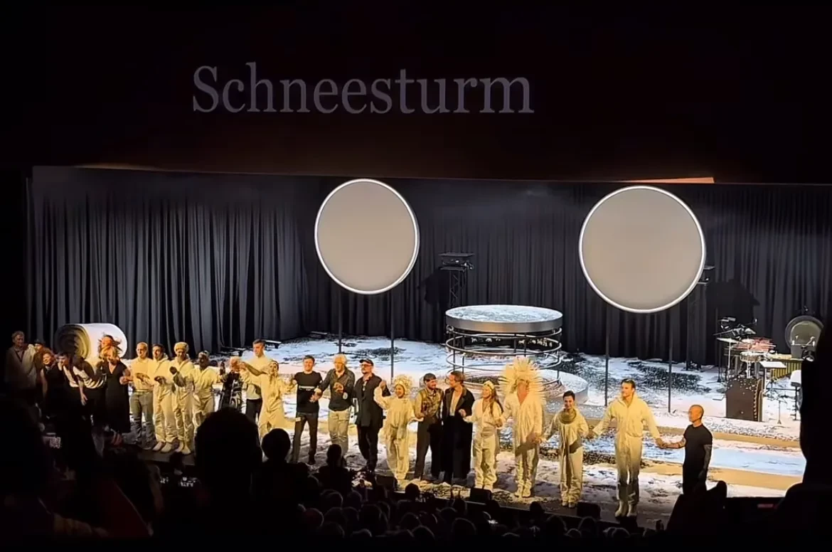 Владимир Сорокин и Кирилл СеребренниковВ спектакле "Метель" приняли участие российские актёры Варвара Шмыкова и Филипп Авдеев, а также финалистка шоу "Голос" Ян Гэ и звезда "Мастера и Маргариты" Аугуст Диль.