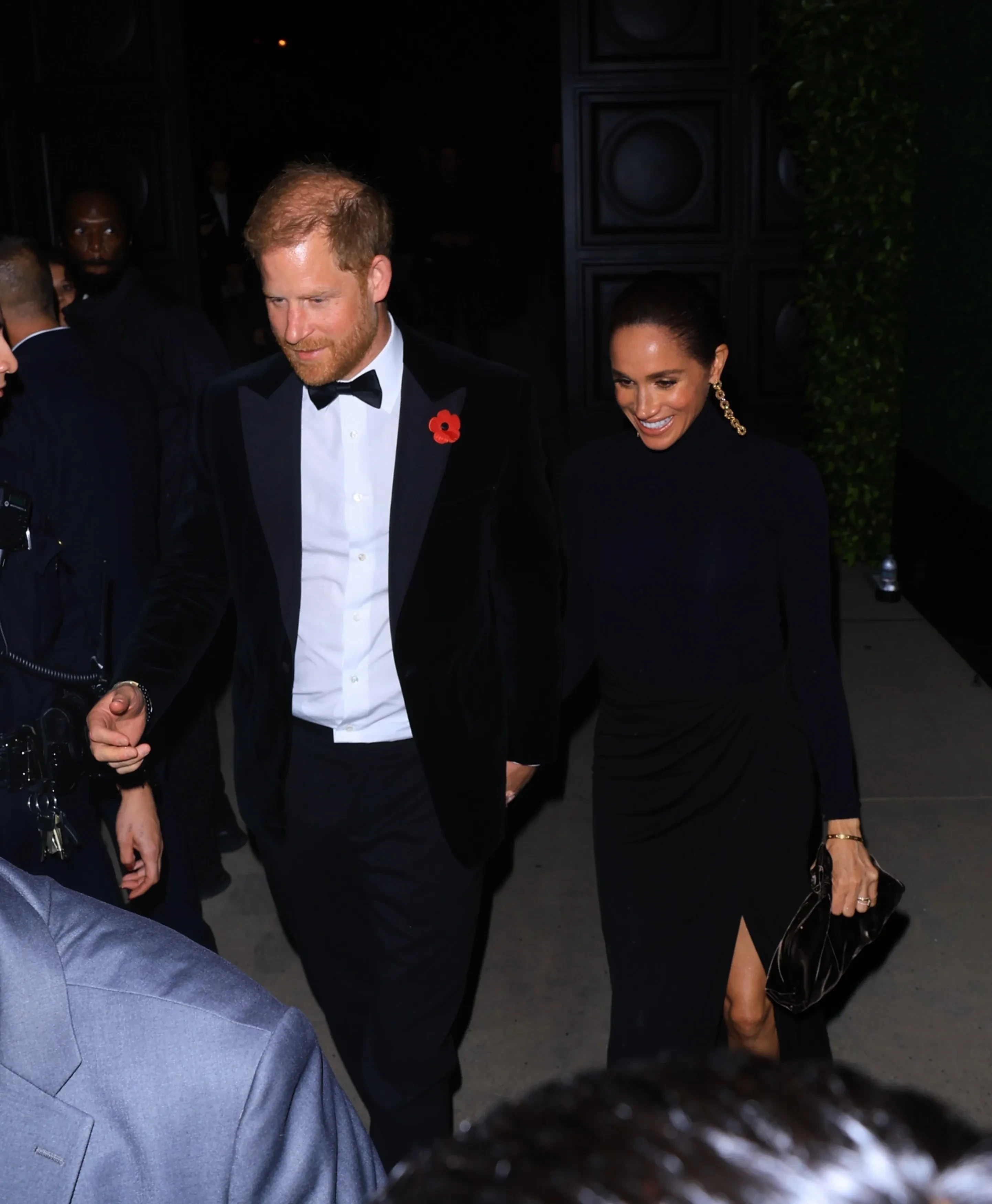 Герцогиня Сассекская выбрала для вечера длинное чёрное платье с высоким воротом и длинным разрезом на юбке, а её муж пришёл в чёрном костюме. Любопытная деталь: Гарри прикрепил к лацкану пиджака брошь в виде красного мака — символ Дня памяти, который сегодня отмечают в Великобритании.