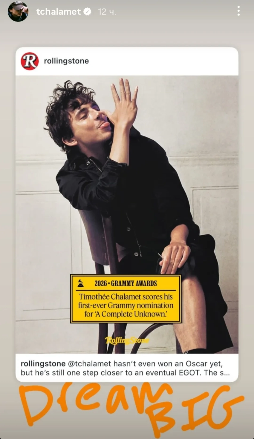 ВалерияЗато среди номинантов на “Грэмми” оказался Тимоти Шаламе, хоть и не является по профессии певцом. Эксперты отметили его работу над саундтреком-сборником к фильму “Боб Дилан: Никому не известный. Актёр уже поздравил самого себя в инстаграме*. Он запостил фото журнала Rolling Stone с собой на обложке и написал “Мечтай по-крупному”.