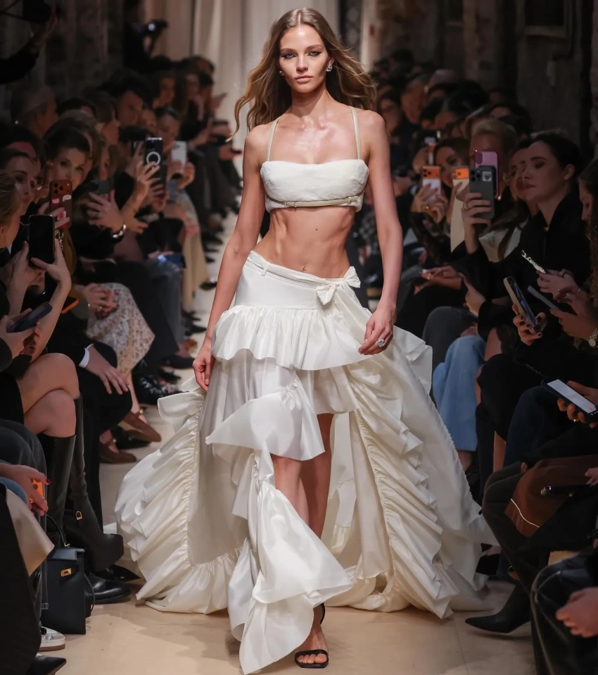 Кафельникова дефилировала в наряде, вдохновлённом образом Марии-Антуанетты. Она продемонстрировала топ из норки и пышную юбку из шёлковой тафты с оборками. По словам Ксении Соловьёвой, которая рассказала о показе в своём телеграм-канале, эта юбка стала единственным изделием, конструкцию которого Терехов не смог объяснить конструкторам. Дизайнер самостоятельно наколол ткань на манекен и затем передал её для технического воплощения.